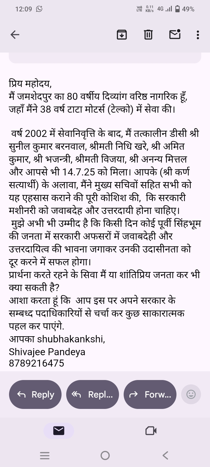 मैं जमशेदपुर का 80 वर्षीय दिव्यांग वरिष्ठ नागरिक हूँ, जहाँ मैंने 38 वर्ष टाटा मोटर्स (टेल्को) में सेवा की।