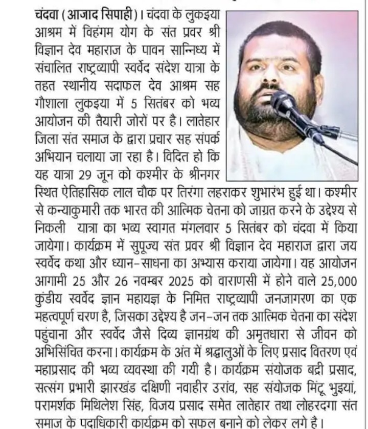 ब्रेकिंग न्यूज़ श्री विज्ञान देव जी महाराज के द्वारा 5 सितंबर से स्वर्वेद यात्रा का शुभारंभ किया जा रहा है