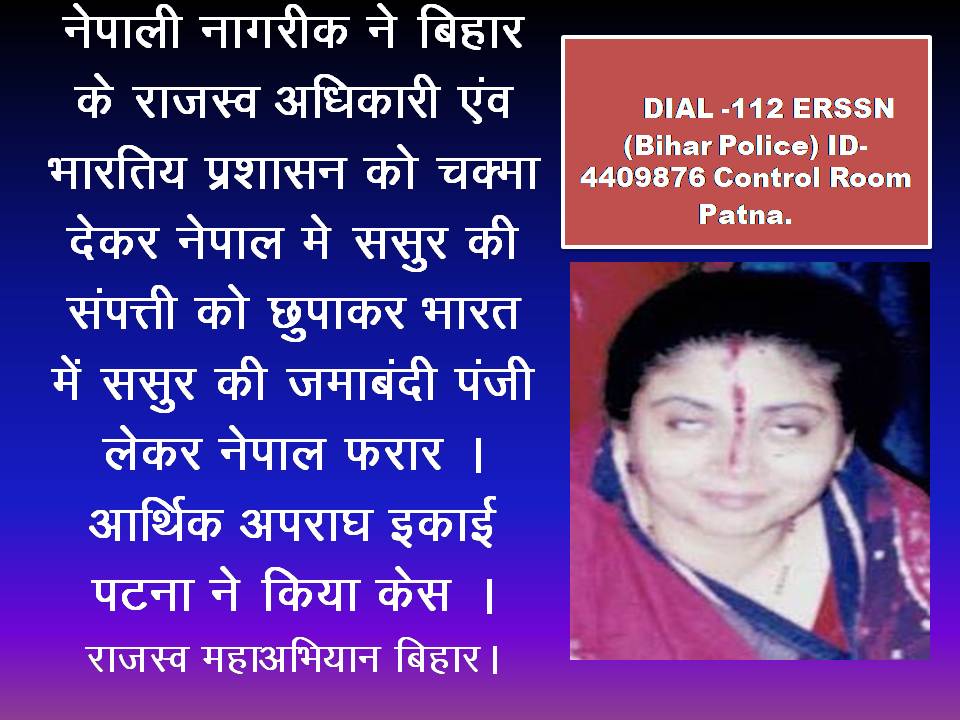 बिहार के जिला मधेपुरा के बिहारीगंज राज्सव अधिकारी एव भारतीय प्रसाशन को आंख में धूल झोंककर नेपाल की नागरिक नेपाल फ़रार हो गई