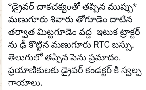 Accident at bhadari kothagudam district manuguru tactor and tsrtc bus