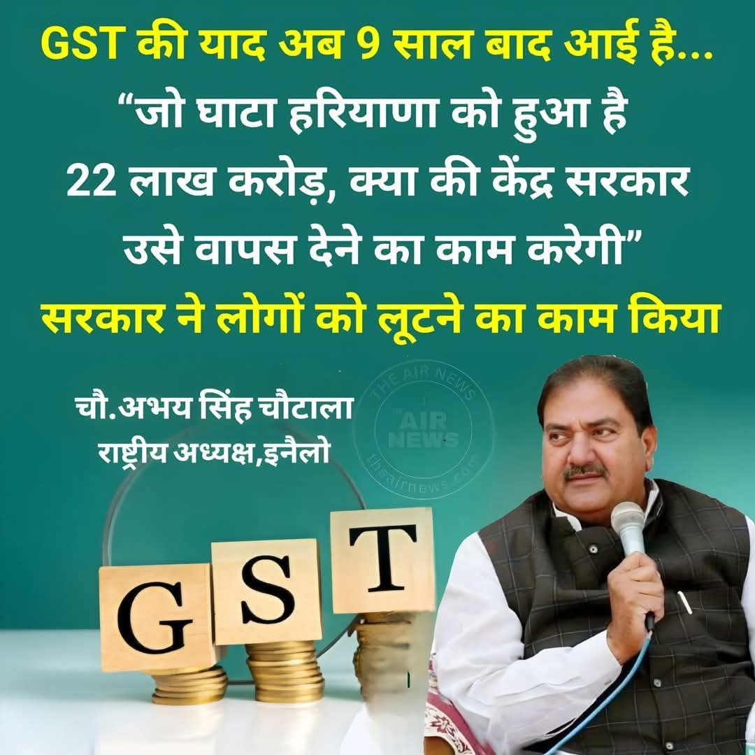 इनेलो के राष्ट्रीय अध्यक्ष चौ. अभय सिंह चौटाला ने केंद्र सरकार पर तीखा हमला बोलते हुए कहा कि जीएसटी लागू होने के 9 साल बाद भी हरियाणा को 22 लाख करोड़ रुपए का भारी नुकसान हुआ है। उन्होंने सवाल उठाया कि क्या केंद्र सरकार अब इस घाटे की भरपाई करेगी?