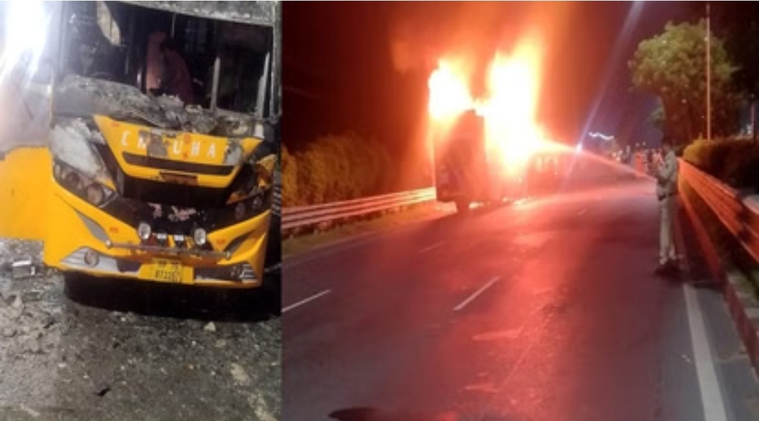 UP: हाईवे पर दौड़ती बस में लगी भीषण आग, यात्रियों ने खिड़कियों से कूदकर बचाई जान