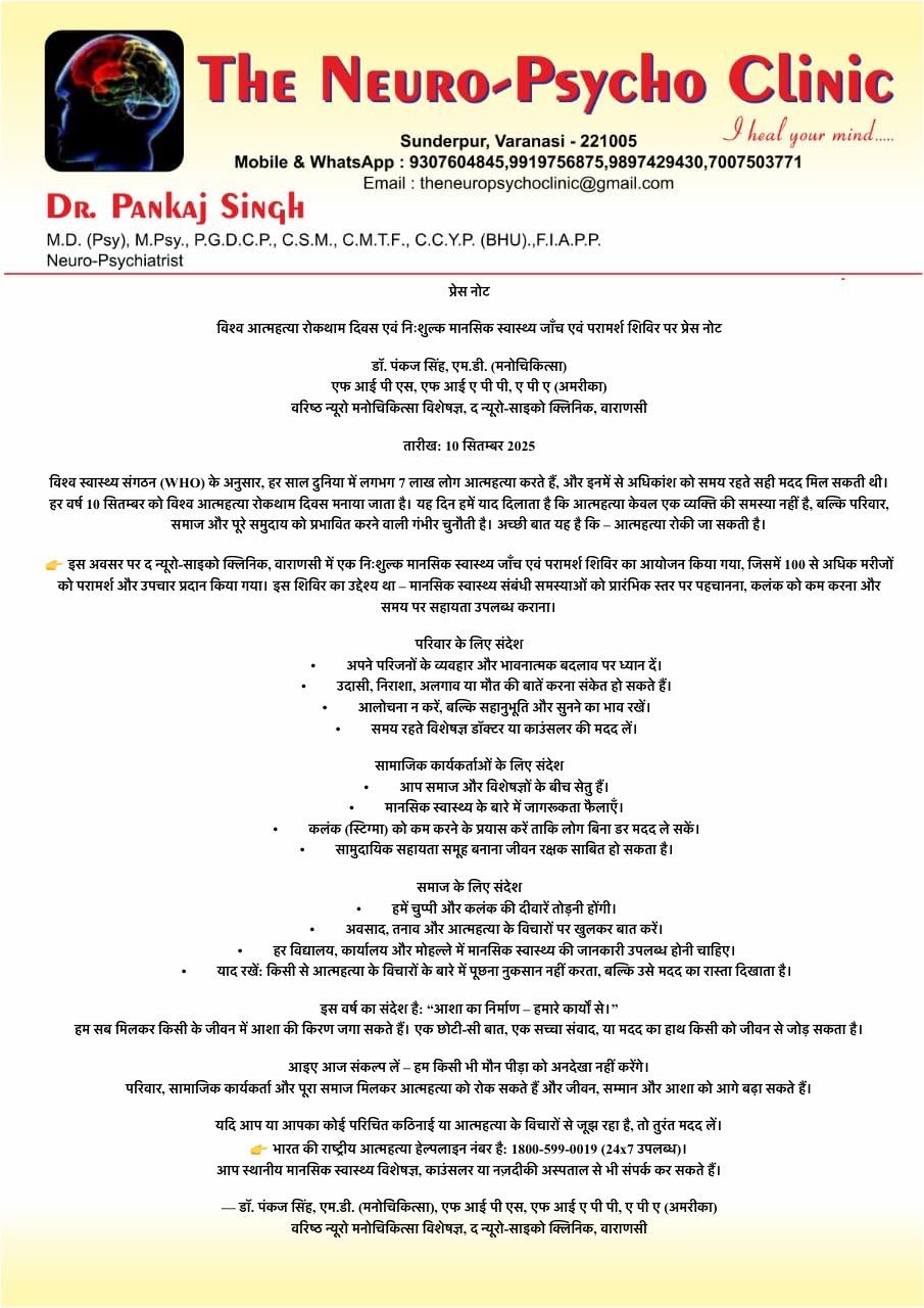 👉 इस अवसर पर द न्यूरो-साइको क्लिनिक, वाराणसी में एक निःशुल्क मानसिक स्वास्थ्य जाँच एवं परामर्श शिविर का आयोजन किया गया, जिसमें 100 से अधिक मरीजों को परामर्श और उपचार प्रदान किया गया। इस शिविर का उद्देश्य था – मानसिक स्वास्थ्य संबंधी समस्याओं को प्रारंभिक स्तर पर पहचानना, कलंक को कम करना और समय पर सहायता उपलब्ध कराना।