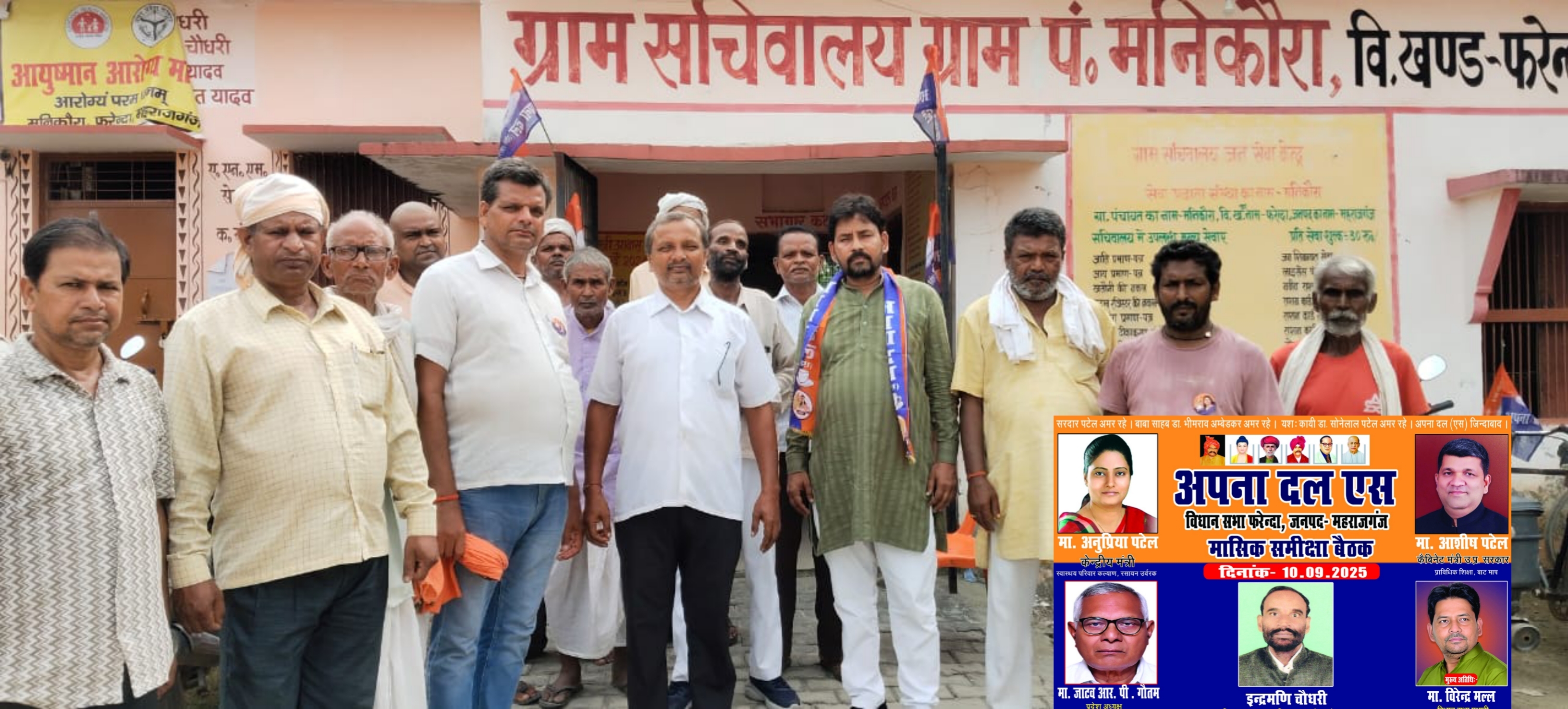 *महाराजगंज।* आनंदनगर क्षेत्र के ग्राम सभा मनिकौरा पोखर पार्क के पंचायत सचिवालय के प्रांगण में इंद्रमणि चौधरी की अध्यक्षता में अपना दल (एस) का मासिक समीक्षा बैठक आयोजित किया गया। बैठक में मुख्य अतिथि के तौर पर अपना दल (एस) के विधान सभा प्रभारी वीरेन्द्र मल्ल उपस्थित रहे। उन्होंने पार्टी के जिम्मेदारी और कर्तव्यों के बारे में सभी को अवगत कराते हुए कहा कि पार्टी किस प्रकार विकसित भारत के संकल्प को लेकर आगे बढ़ रही है। उन्होंने कार्यकर्ताओं से पार्टी में जुड़ने के लिए लोगों को जागरूक करने के लिए भी बात कही। उन्होंने कहा कि पार्टी की जो विचारधारा है उस पर काम करते हैं तो पार्टी भारत को विकसित बनाने में अपनी भूमिका सुनिश्चित करेगी और जनता को हर संभव सुविधा देने की कोशिश करेगी और जहां लोग पार्टी के बारे में नहीं जानते हैं आने वाले समय में किसी पार्टी को एक बड़े राजनीतिक दल के नाम से जानेंगे। इस बैठक में कई पदाधिकारी एवं जनता उपस्थित रही। इस समीक्षा बैठक में कौशल कुमार (ग्राम प्रधान मनिकौरा), रामकेश (पूर्व ग्राम प्रधान मनिकौरा), अजय यादव (पश्चिमी जोन अध्यक्ष), रमेश चौधरी (विधानसभा कार्यकारिणी सदस्य), विजय श्रीवास्तव (दक्षिणी जोन अध्यक्ष), वीरेंद्र विश्वकर्मा (सेक्टर अध्यक्ष अगया), राजन गौंड (विधानसभा मीडिया प्रभारी), कृष्ण कुमार चौधरी, प्रमोद चौधरी उर्फ बबलू, प्रेम गौंड, करणशंकर पाण्डेय इत्यादि लोग उपस्थित रहे।
