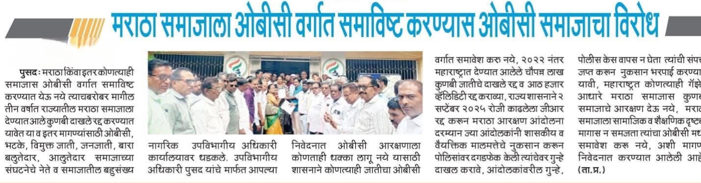 मराठा समाजाला ओबीसी मध्ये समाविष्ट करू नका