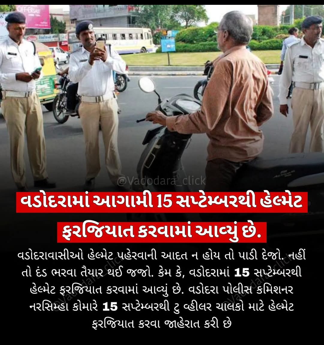 ... વડોદરા પોલીસ કમિશ્નરે 15 સપ્ટેમ્બરથી ટુ-વ્હીલર વાહન ચાલકો માટે હેલ્મેટ ફરજિયાત કરવાની જાહેરાત કરી છે...