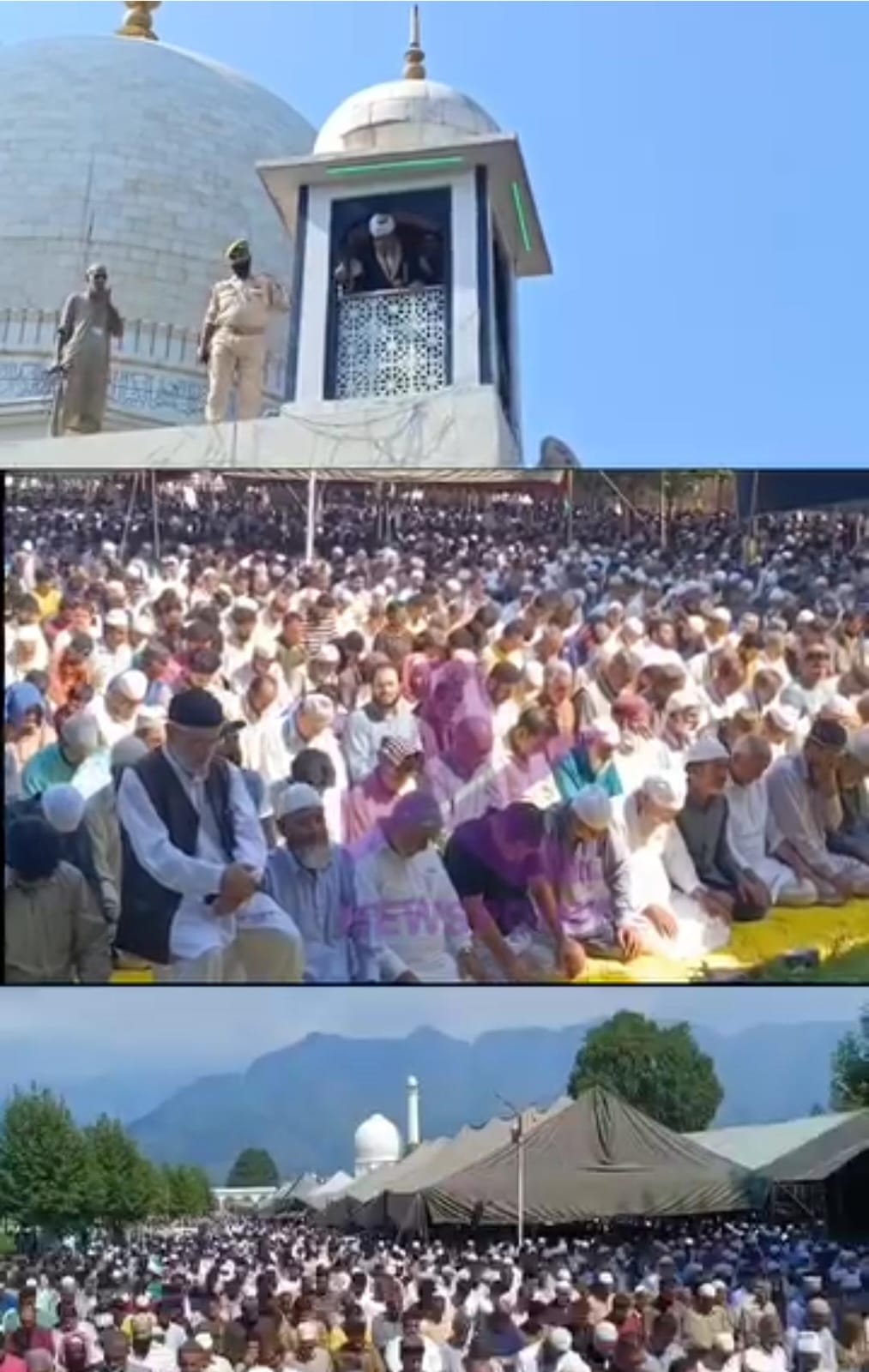 Srinagar, Sep 13,The Hazratbal shrine today witnessed a sea of devotees on Friday as thousands of faithful assembled to offer congregational prayers and seek blessings by witnessing the display of the revered holy relic of Prophet Muhammad (SAW).