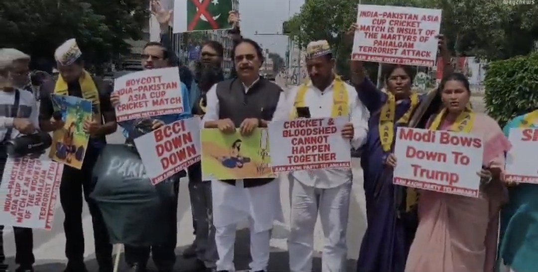 आम आदमी पार्टी के नेताओं ने शहर के एलबी स्टेडियम के सामने विरोध प्रदर्शन किया और दुबई में आयोजित एशिया कप के तहत भारत-पाकिस्तान मैच का बहिष्कार करने की मांग की।