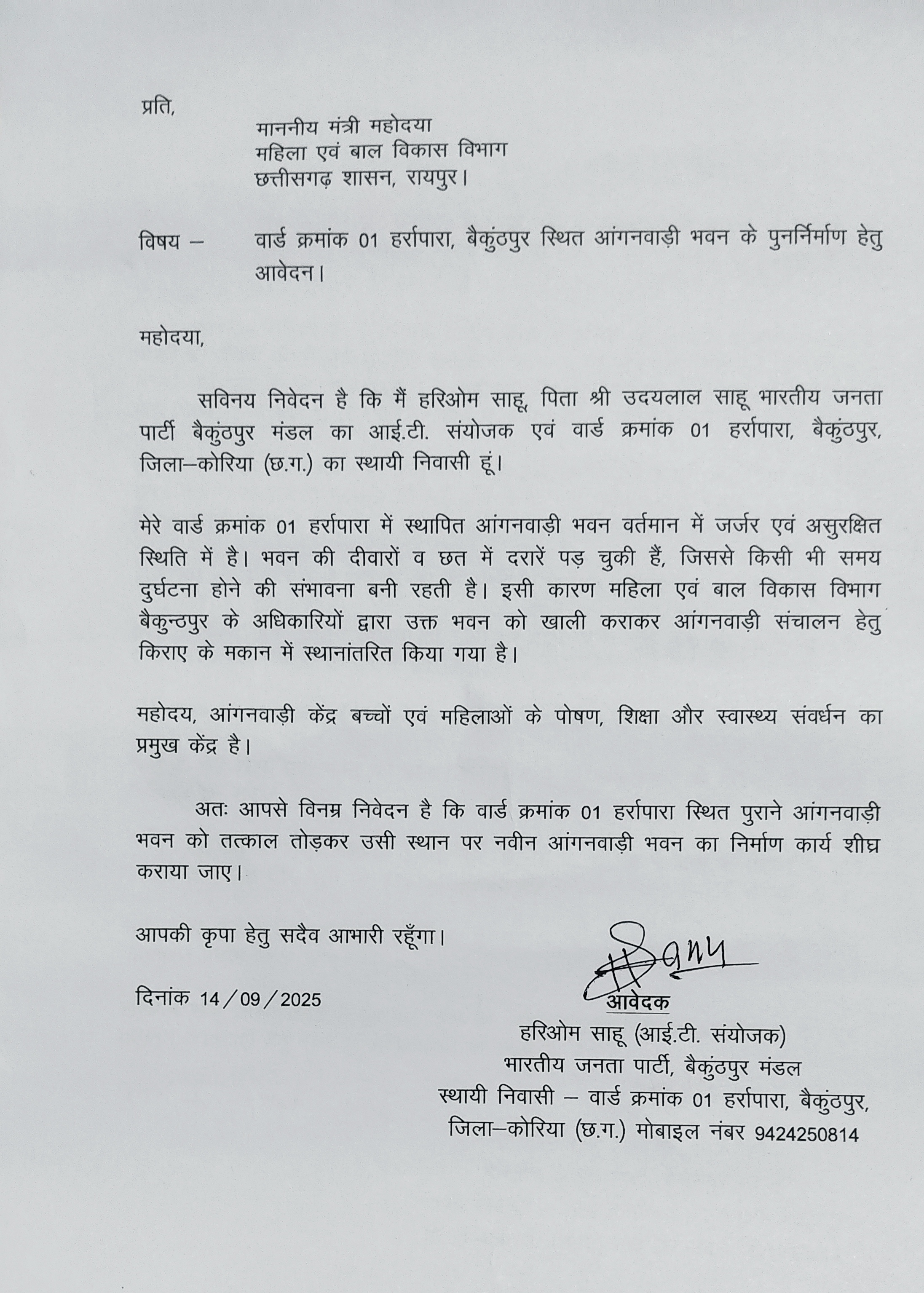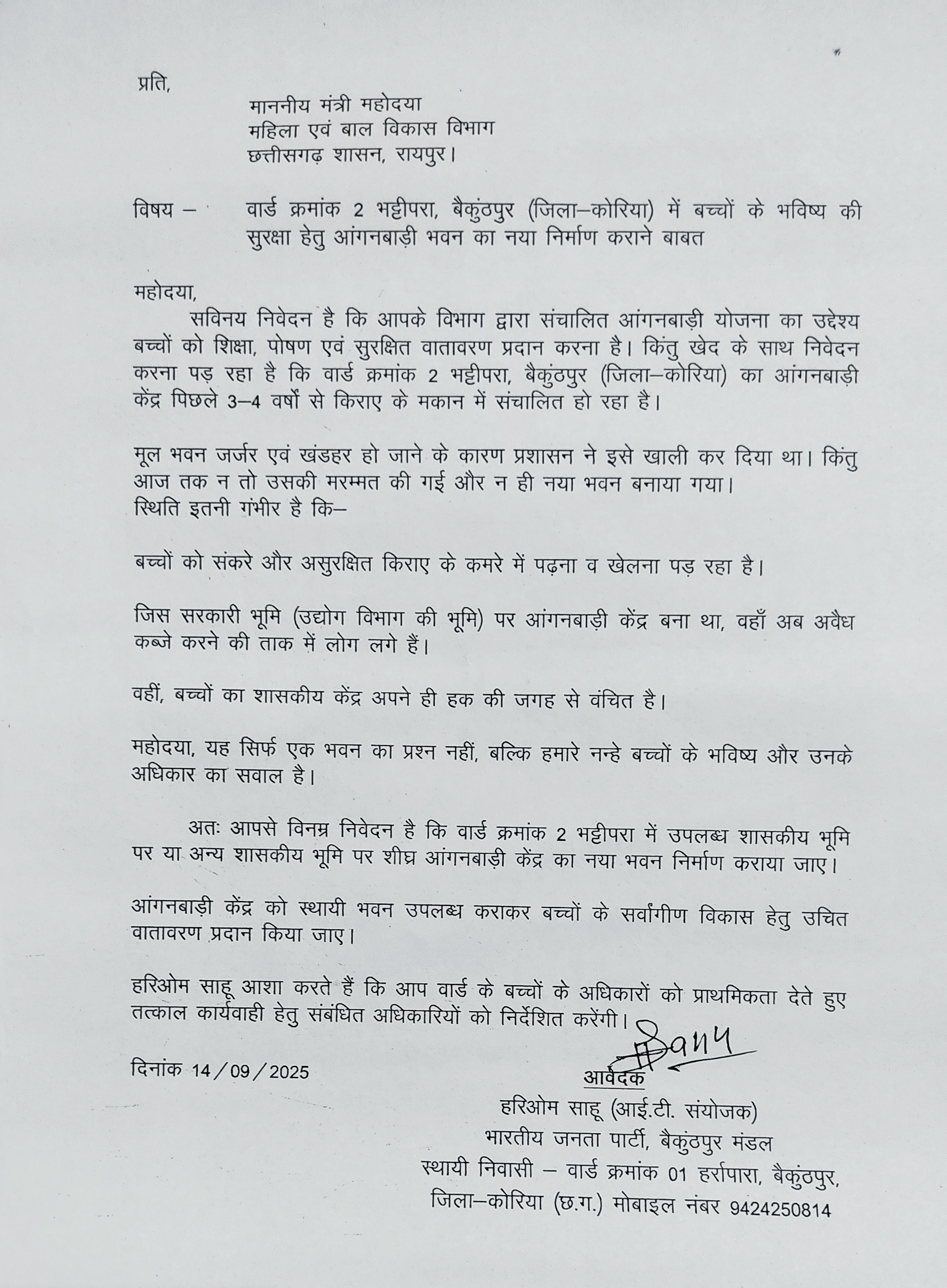वार्ड क्रमांक 1 एवं 2 बैकुंठपुर के आंगनबाड़ी केंद्र की जर्जर स्थिति को लेकर आज माननीय महिला एवं बाल विकास मंत्री जी को आवेदन सौंपा गया।