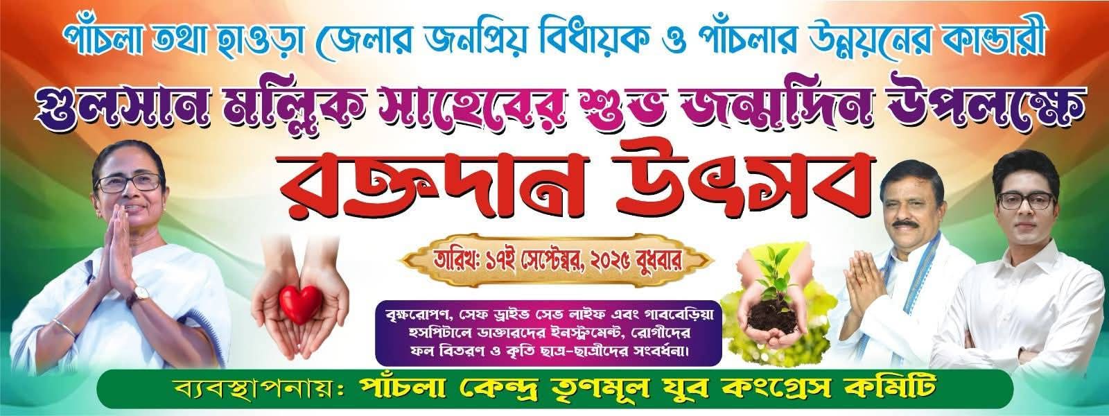 আসুন পাঁচলার উন্নয়নের কান্ডারী বিধায়ক - Gulsan Mullick মহাশয় এর শুভ জন্মদিনে রক্ত দান করে মানব কল্যানে নতুন অঙ্গীকারে আবদ্ধ হয়।