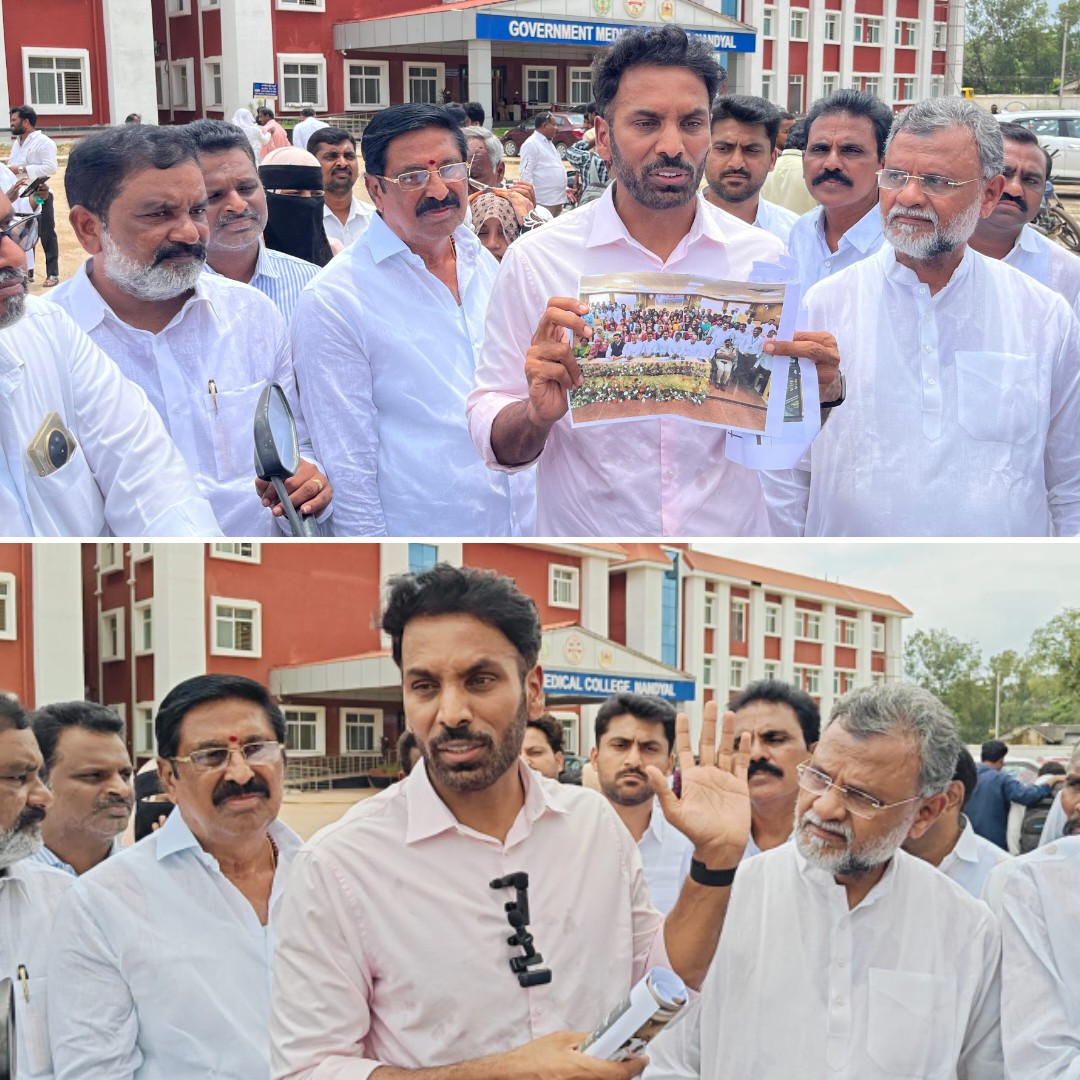 ఈ సందర్భంగా మాజీ ఎమ్మెల్యే శిల్పా రవిచంద్రకిషోర్ రెడ్డి, ఎమ్మెల్సీ ఇసాక్ బాష మాట్లాడుతూ…..మాజీ సీఎం వైఎస్ జగన్మోహన్ రెడ్డి హయాంలో రాష్ట్రంలో 17 మెడికల్ కళాశాలను ఏర్పాటు చేసేందుకు చర్యలు చేపట్టడం జరిగిందని, దశల వారిగా 5మెడికల్ కళాశాలను సెప్టంబర్ నెల 15వ తేది నాటికి నంద్యాల మెడికల్ కళాశాలతో సహా మచిలీపట్నం, ఏలూరు, రాజమహేంద్రవరం, విజయనగరంలో అట్టహాసంగా ప్రారంభించడం జరిగిందన్నారు. నేటికి ఈ మెడికల్ కళాశాలలు ప్రారంభించి 2 సంవత్సరాలు పూర్తి అయ్యాయని, అలాగే ఈ విద్యాసంవత్సరంలో 3వ సారి అడ్మిషన్ల ప్రక్రియకూడా ప్రారంభించి పూర్తి కావస్తుందని తెలిపారు. చారిత్రక ఆధారాలు ఉన్నవాటిని కూడా కాదని రాష్ట్ర హోంశాఖ మంత్రి వంగలపూడి అనిత పవర్ పాయింట్ ప్రజెంటేషన్ ద్వార నంద్యాల మరియు ఇతర నాలుగు ప్రాంతాలలో నిర్మించిన మెడికల్ కళాశాలల ఆనవాళ్లు లేవని మాజీ సీఎం వైఎస్ జగన్మోహన్ రెడ్డి మాయ చేశాడని మంత్రాలు వేస్తాడని హాస్యాస్పద వ్యాఖ్యలు చేయడం విడ్డూరంగా ఉందని అన్నారు. చంద్రబాబు నాయుడు మాదిరి అమరావతిని గ్రాఫిక్స్ లో చూపించినట్లు నంద్యాల మెడికల్ కళాశాలను చూపడం సాధ్యం కాదని.. ఒక్కసారి చారిత్రక మెడికల్ కళాశాల నిర్మాణాలను కళ్లుపెట్టుకుని చూడాలని వాస్తవాలను, నిజానిజాలను తెలుసుకొని మాట్లాడాలని మంత్రి అనిత చేసిన అసత్యపు ఆరోపణలపై తీవ్రంగా మండిపడ్డారు. నంద్యాల మెడికల్ కళాశాలకు అనుమతులు రావడానికి మాజీ ఎంపీ పోచా బ్రహ్మానందరెడ్డి, మాజీ ఎమ్మెల్యే శిల్పా రవిచంద్రకిషోర్ రెడ్డి, నాటి జిల్లా కలెక్టర్ ఎంతో ప్రయత్నాలు చేసి చివరకు మెడికల్ కళాశాలను ప్రారంభించామని గర్వంగా చెబుతున్నామన్నారు. టీడీపీ నాయకులు మెడికల్ కళాశాల అనుమతులు రాకుండా కోర్టులలో కేసులు వేశారని అయినా అనేక సార్లు కోర్టుల వెంట తిరిగి మెడికల్ కళాశాలను సాధించామన్నారు. ఈ కళాశాలలో ప్రథమ సంవత్సరంలో 150 మంది వైద్య విద్యార్థులు, రెండవ సంవత్సరంలో 150 మంది వైద్య విద్యార్థులు అలాగే ఈ విద్యా సంవత్సరంలో 150 మంది వైద్య విద్యార్థులు చదువుతున్నారని తెలిపారు. నంద్యాల మెడికల్ కళాశాలకు చెందిన మహేష్ అనే ప్రథమ సంవత్సరం చదివిన విద్యార్థి యూనివర్సిటీ టాపర్ గా నిలిచాడన్నది చారిత్రాక సాక్షం అని నంద్యాల మెడికల్ కళాశాల ఎంతో గర్వకారణంగా నిలిచిందన్నారు. ఎన్.ఎం.సీ అనుమతులతో ప్రారంభించిన కళాశాలకు సంబంధించి ప్రస్తుతం నిర్మిస్తున్న భవనాలను నేటికీ కూటమి ప్రభుత్వం పూర్తి చేయలేదని, అలాగే పులివెందులలో మెడికల్ కళాశాల నిర్మాణం పూర్తి అయినా కూడా ముఖ్యమంత్రి చంద్రబాబు నాయడు, కూటమి ప్రభుత్వం తమకు మెడికల్ కళాశాలకు అనుమతులు వద్దని అడ్మిషన్ల ప్రక్రియ రద్దు చేయమని ఎన్.ఎం.సి కి ఉత్తరాలు పంపారని తెలిపారు. ప్ర