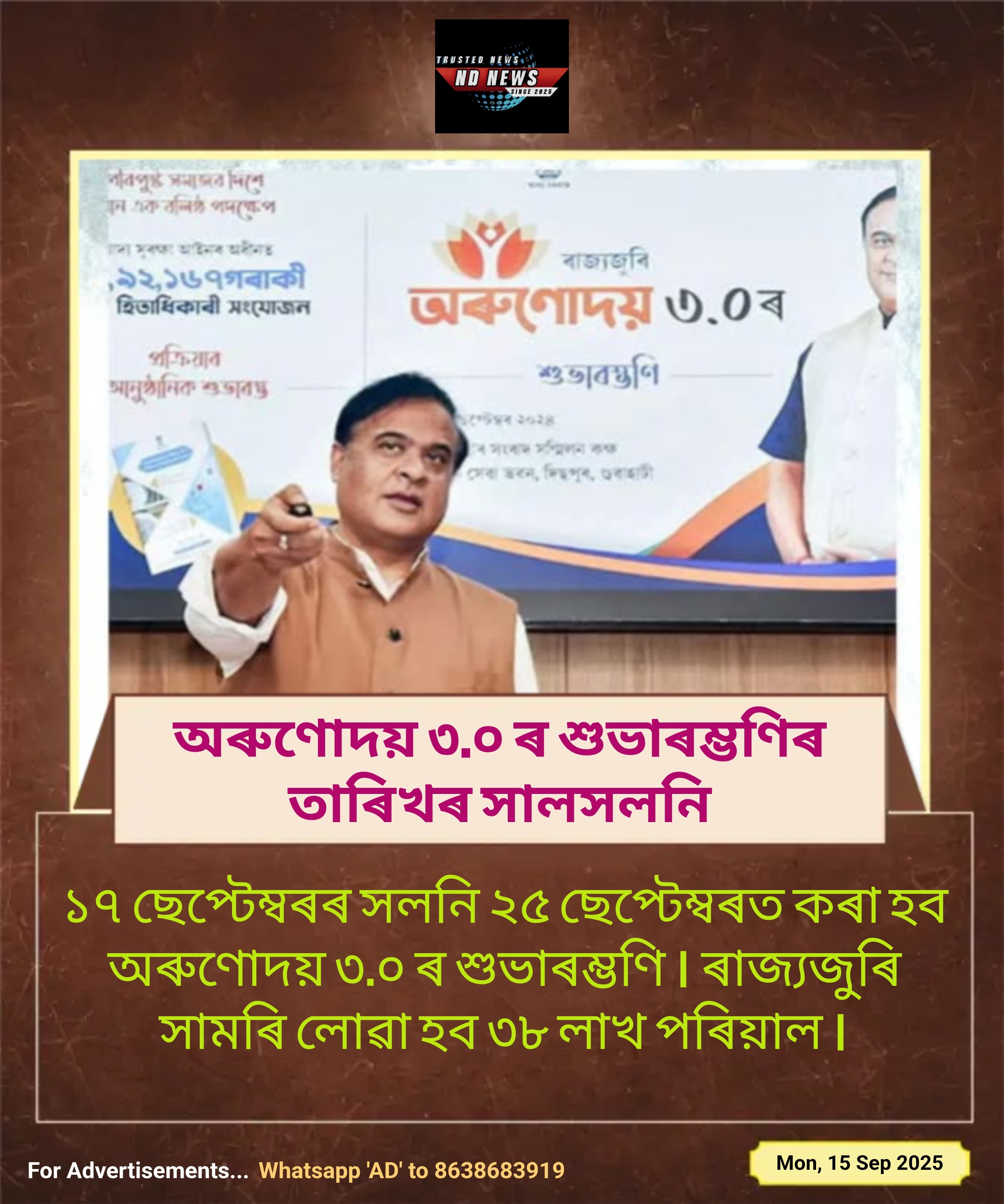 ১৭ ছেপ্টেম্বৰৰ সলনি ২৫ ছেপ্টেম্বৰত কৰা হব অৰুণোদয় ৩.০ ৰ শুভাৰম্ভণি । অসম ৰাজ্য জুৰি সামৰি লোৱা হব ৩৮ লাখ পৰিয়াল ।