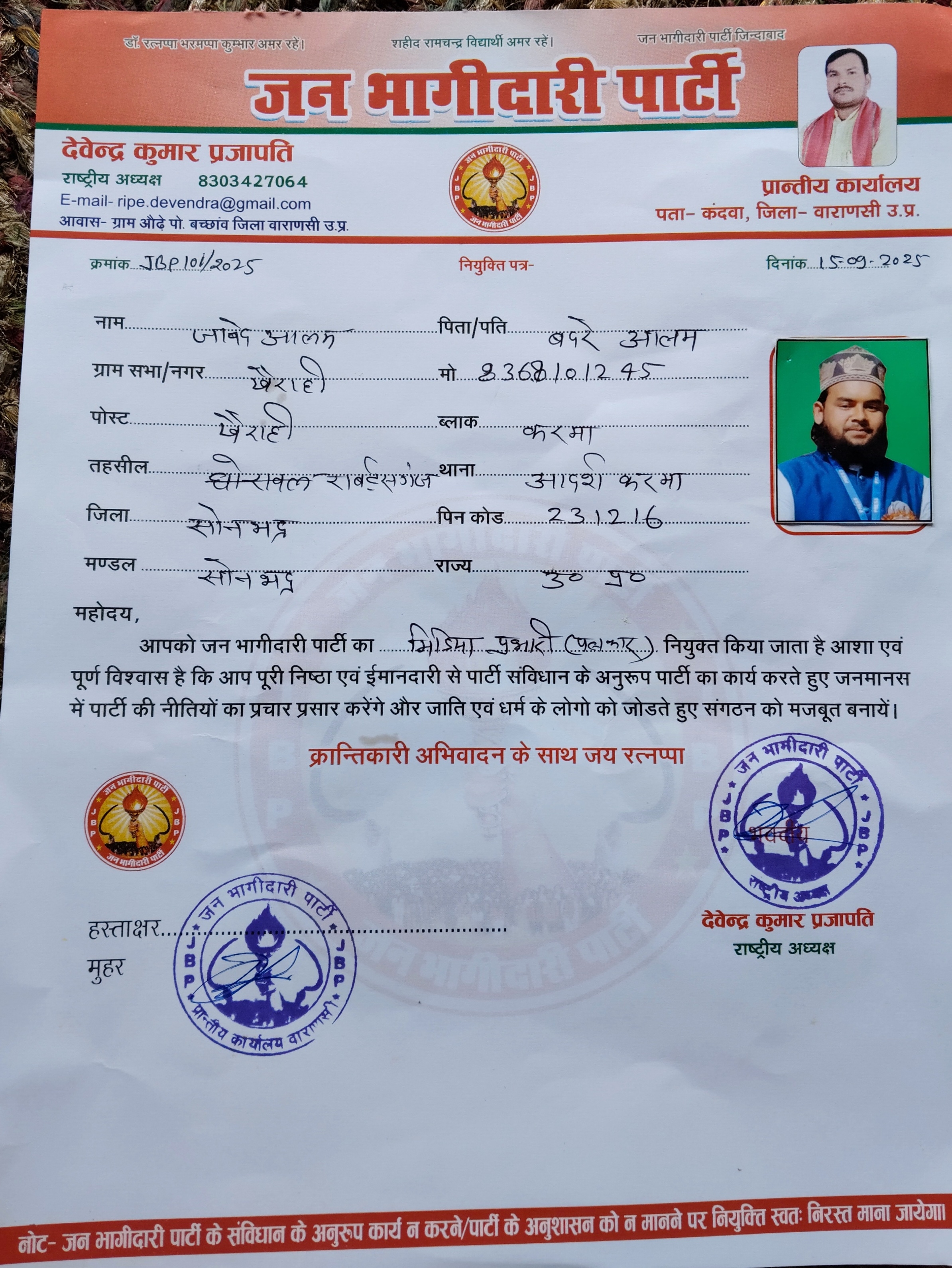 जन भागीदार पार्टी राष्ट्रीय अध्यक्ष देवेन्द्र कुमार प्रजापति जी द्वारा जावेद आलम रजवी को मीडिया प्रभारी सोनभद्र का बनाया गया है l