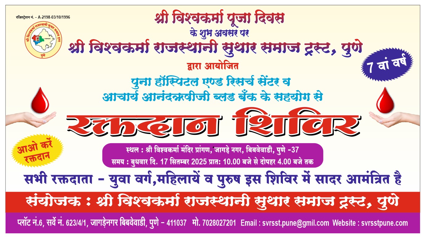 पुणे। श्री विश्वकर्मा राजस्थानी सुथार समाज ट्रस्ट, पुणे द्वारा आगामी बुधवार, 17 सितम्बर 2025 को मंदिर प्रांगण में श्री विश्वकर्मा पूजा दिवस का भव्य आयोजन किया जाएगा।