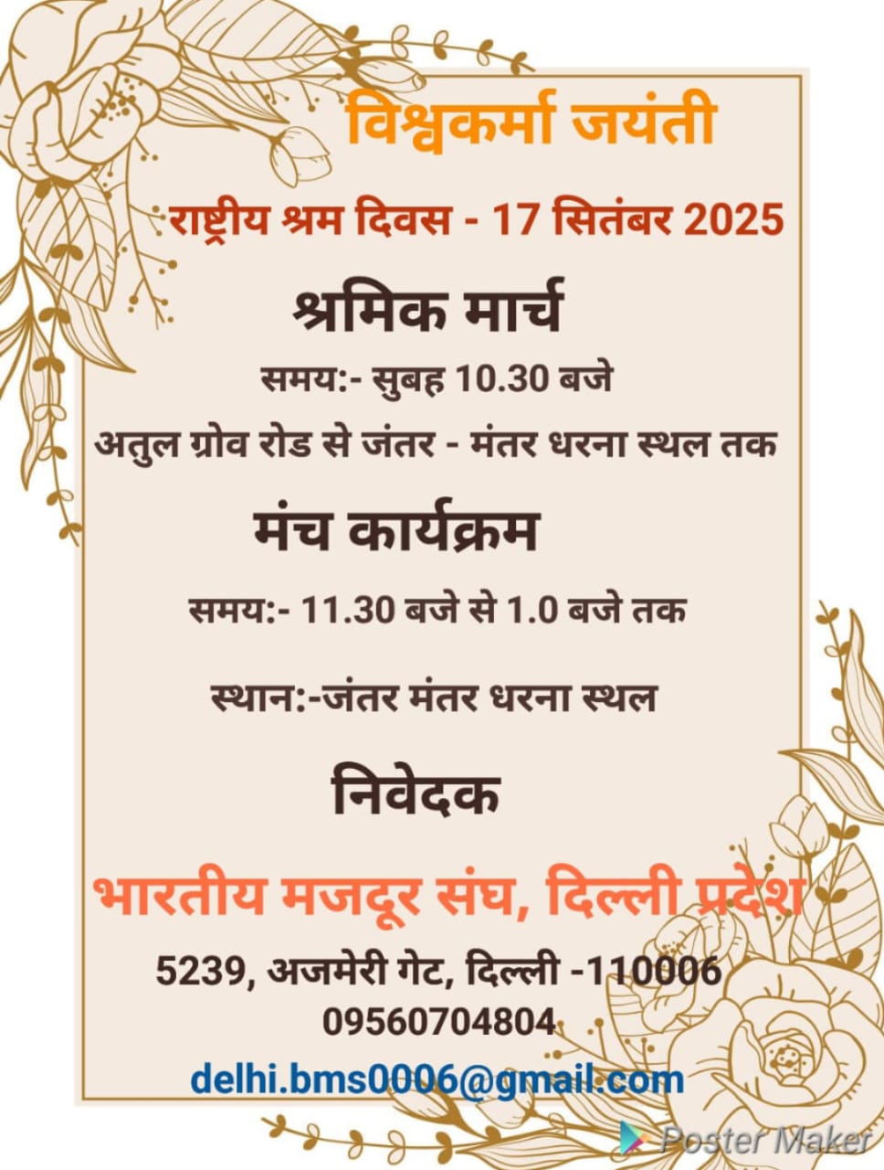 आज विश्वकर्मा जयंती पर भारतीय मजदूर संघ जंतर मंतर पर श्रमिक मार्च करने जा रही है ये कार्यक्रम आज सुबह 10:30 बजे अतुल ग्रोव रोड से चलकर जंतर मंतर तक आएगा इसमें भारतीय मजदूर संघ के उच्च अधिकारी शामिल होंगे दीपेंद्र जी,विनोद मालिक जी,सुरेंद्र मलिक जी,भानु भास्कर जी गुगन जी प्रस्तुत रहेंगे इनका कहना है कि डीटीसी में कच्चे कर्मचारियों को पक्का करने की दिल्ली सरकार से गुहार लगाई जाएगी वैसे भी भारतीय मजदूर संघ कर्मचारियों के हित में कार्य करती रही है।