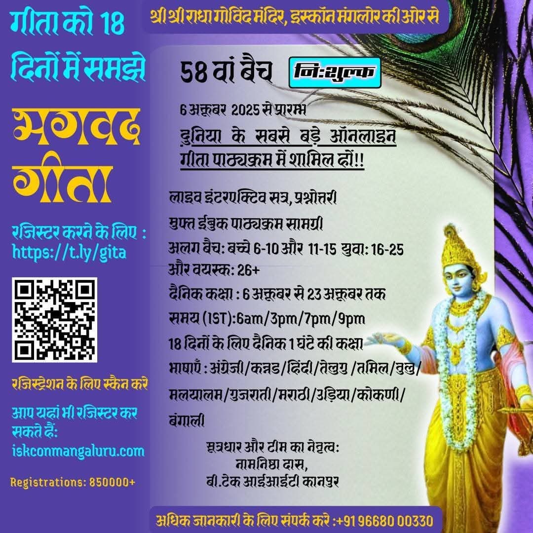 हरे कृष्ण इस्कॉन® कुलाई, मैंगलोर, की वेबसाइट पर *रजिस्टर करें* अपनी भाषा में ऑनलाइन माध्यम से मुफ़्त गीता सीखें 18 दिन मे 👇