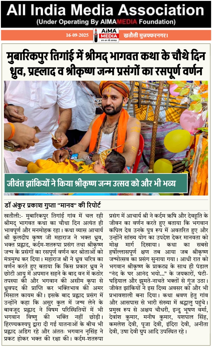 मुबारिकपुर तिगांई में श्रीमद् भागवत कथा के चौथे दिन ध्रुव, प्रह्लाद व श्रीकृष्ण जन्म प्रसंगों का रसपूर्ण वर्णन