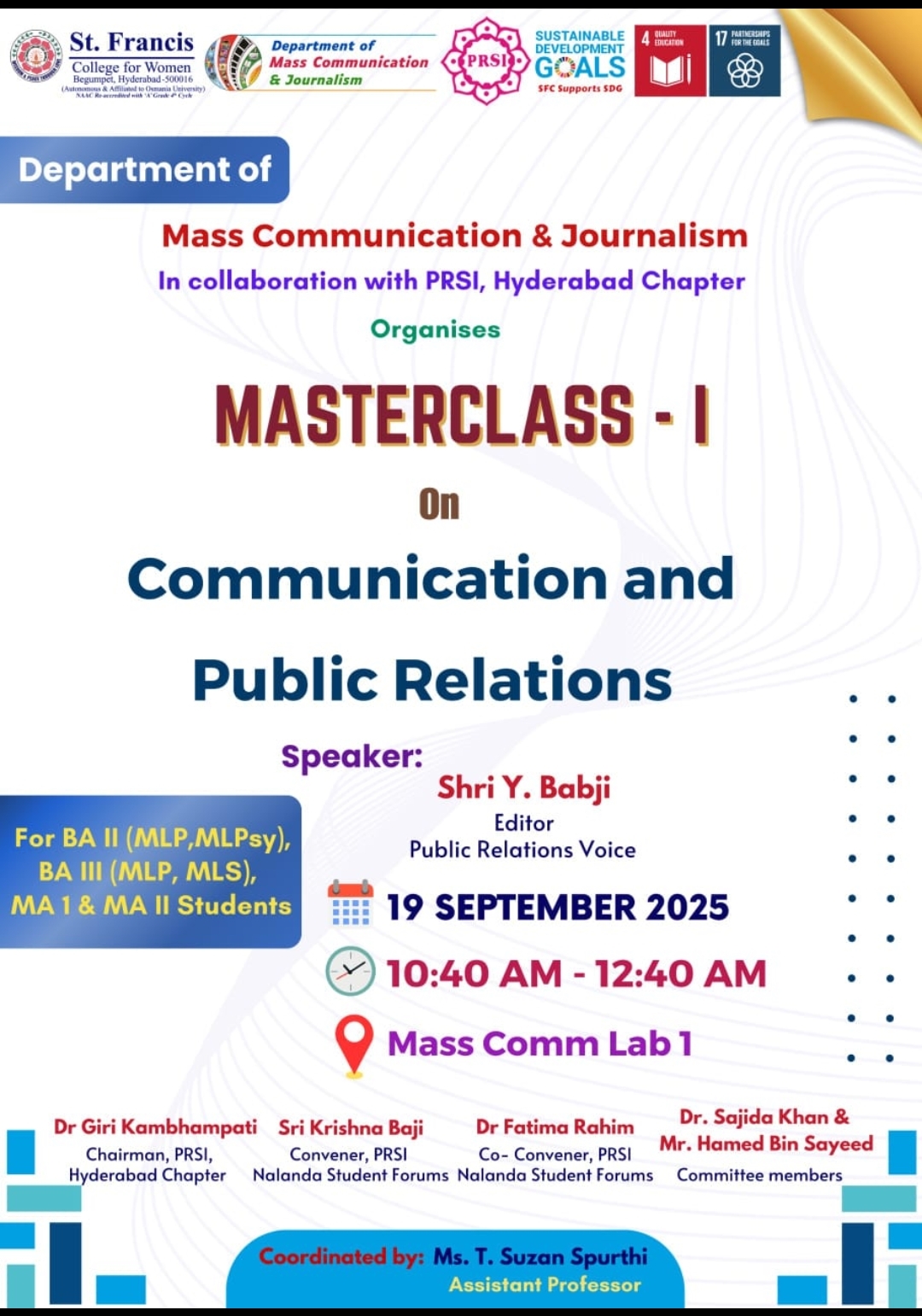 At St Francis College for Women, Begumpet hosted the 1st Master Class after it's entering into Nalanda Student Forum MoU with PRSI Hyderabad Chapter