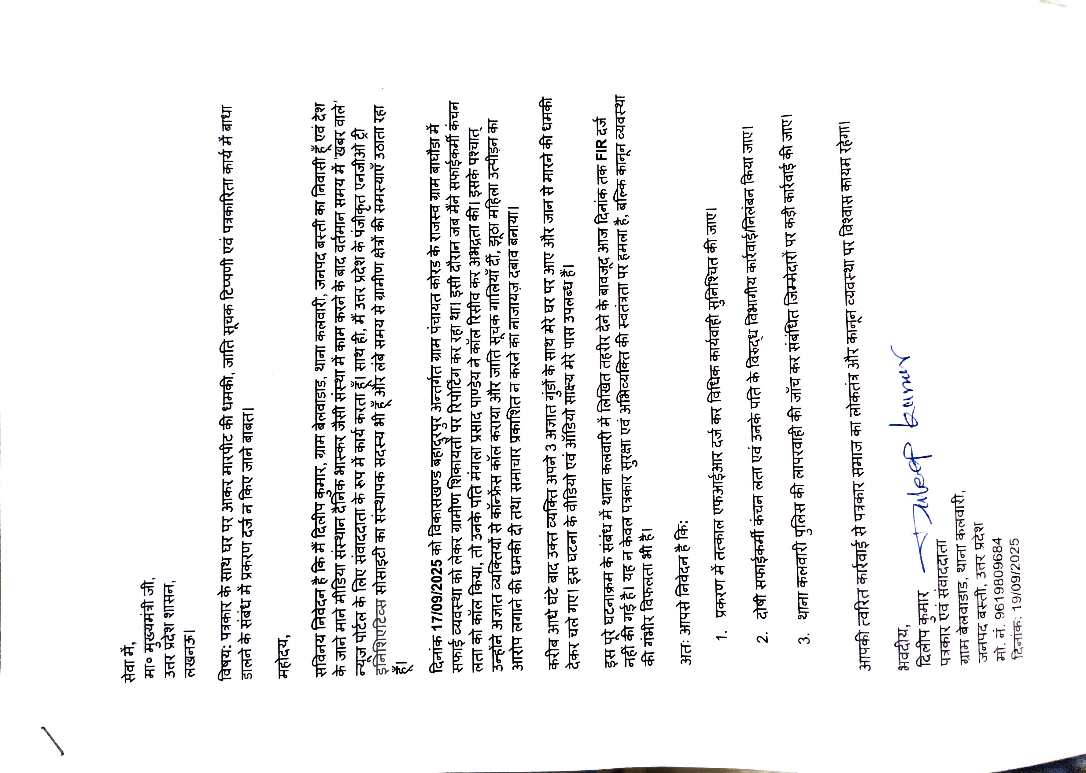 बस्ती। बेलवाडाड़ निवासी खबर वाले पोर्टल के संवाददाता दिलीप कुमार ने अपने साथ हुई मारपीट की धमकी, जातिसूचक गालियों और पत्रकारिता कार्य में बाधा डालने के मामले में मुख्यमंत्री कार्यालय को शिकायत दी है। उन्होंने दोषियों के विरुद्ध कठोरतम कार्यवाही की मांग की है।