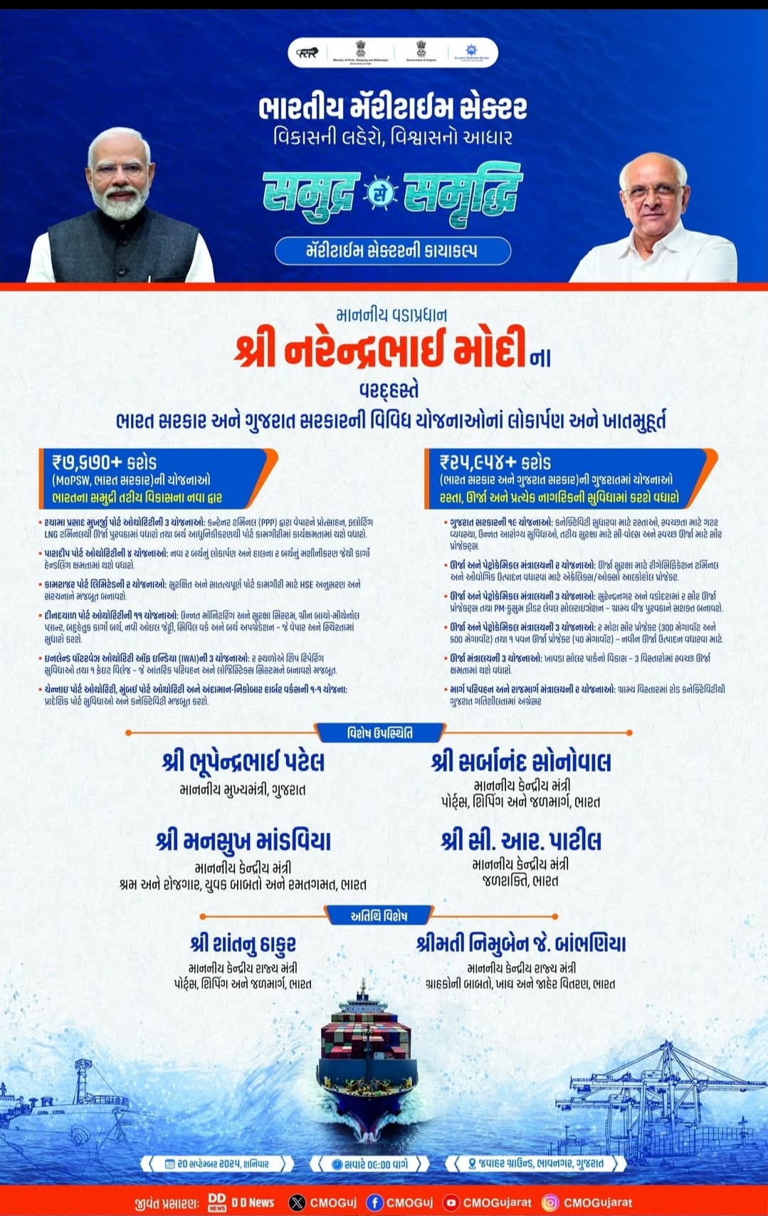 માનનીય વડાપ્રધાન શ્રી નરેન્દ્ર મોદી ગરિમા મય ઉપસ્થિતિમાં આજે ભાવનગર ખાતે યોજાશે વિકસિત ભારતના નિર્માણમાં મહત્વપૂર્ણ ભૂમિકા ભજવતા મેરી ટાઈમ એક્ટરનૂન અત્યાધુનિક વિકસિતની ઉજવણી ઉત્સવ " સમૃદ્ધ અને સમૃદ્ધિ " ....