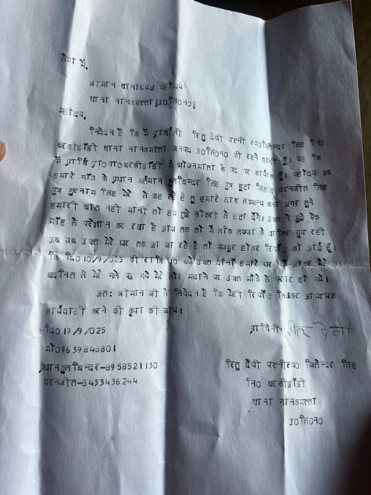 ग्राम बरकीडंडी के नवनिर्मित ग्राम प्रधान पति कुलविंदर सिंह उर्फ पिंटू एवं चरणजीत सिंह उर्फ चांझी ने देर रात लगभग 10 बजे एक विधवा के घर जाकर बतमीजी की ओर आंवला नारी की लज्जा का अपमान करने की कोशिश की ।जब महिला ने सौर मचाए तो मौका देख दोनों भाग गए और अगली सुबह नानकमत्ता थे में तहरीर दी और अभी रिपोर्ट पुलिस के पास है।