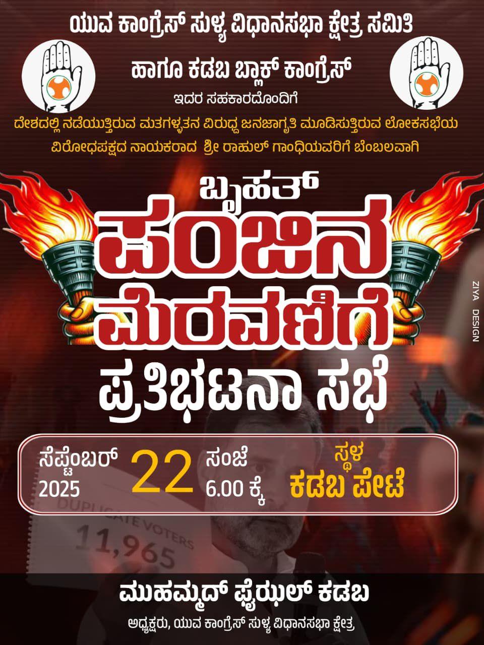 ಇದಕ್ಕೆ ಬೆಂಬಲವಾಗಿ ಸುಳ್ಯ ವಿಧಾನ ಸಭ ಕ್ಷೇತ್ರದ ಯುವ ಕಾಂಗ್ರೆಸ್ ಸಮಿತಿಯ ವತಿಯಿಂದ ಬೃಹತ್ ಪಂಜಿನ ಮೆರವಣಿಗೆ ಮತ್ತು ಪ್ರತಿಭಟಣಾ ಸಭೆ ಸಪ್ಟೆಂಬರ್ 22 ರಂದು , 2025 ಸೋಮವಾರ ದಂದು ನಡೆಯಲಿದೆ, ಈ ಮೆರವಣಿಗೆ ಅನುಗ್ರಹ ಸಭಾ ಭವನದ ಎದುರುಗಡೆಯಿಂದ ಕಡಬ ಮುಖ್ಯ ಪೇಟೆಯವರೆಗೆ ಪಂಜಿನ ಮೆರವಣಿಗೆ ನಡೆಯಲಿದೆ.