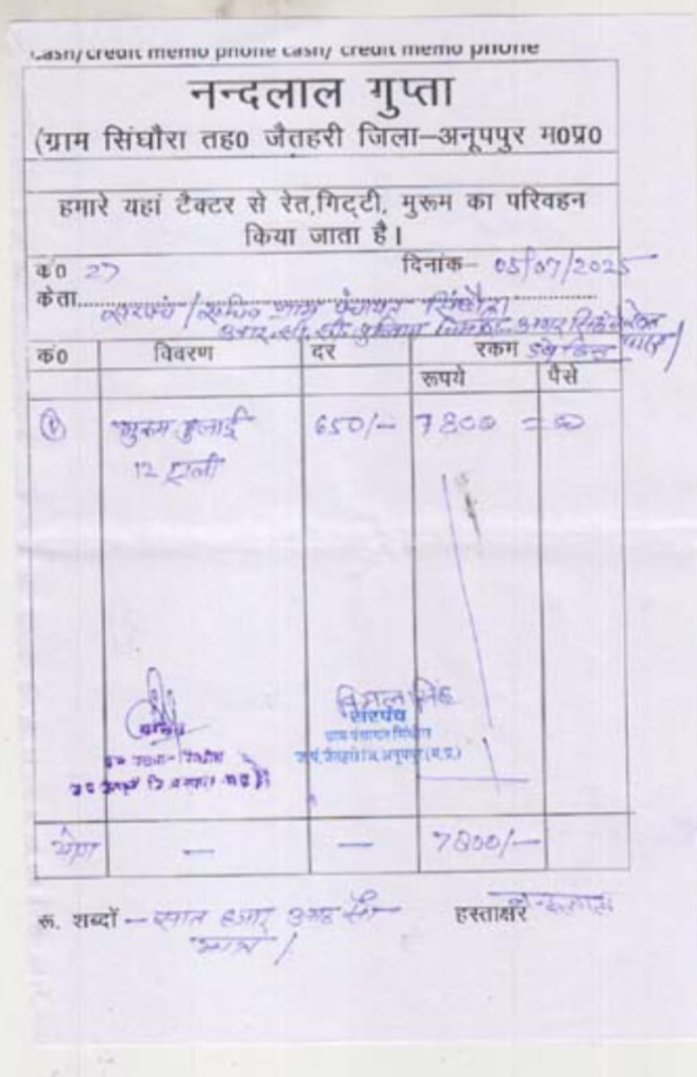 जानकारी के अनुसार सप्लायर नंदलाल गुप्ता ने पंचायत को 12 ट्राली मुरुम दिए जाने का दावा किया है। प्रति ट्राली 650 रुपए की दर से कुल 7,800 रुपए का बिल बनाकर भुगतान भी कर दिया गया।