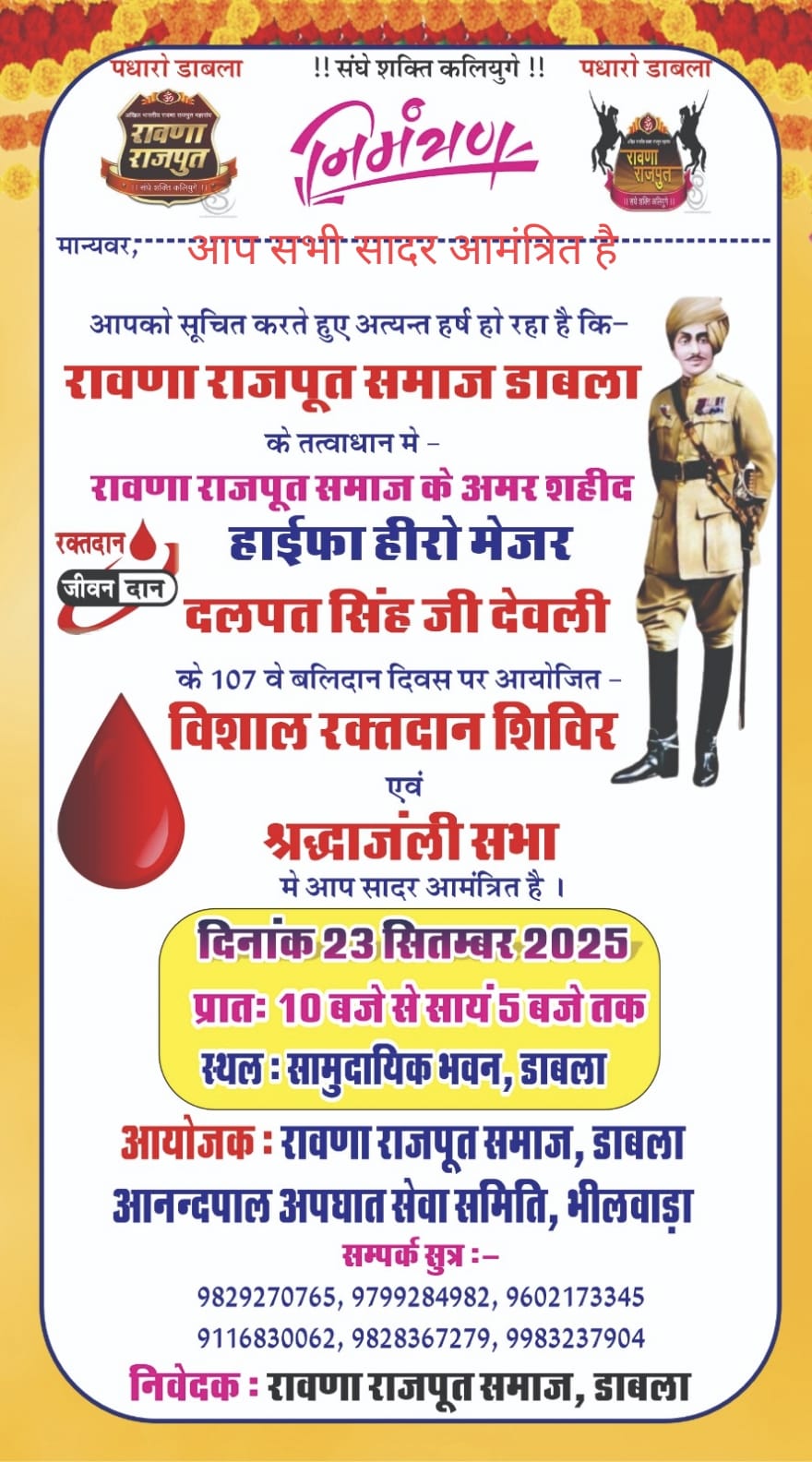 *भीलवाड़ा जिले के डाबला गांव के सामुदायिक भवन में रावणा राजपूत समाज के अंतर्राष्ट्रीय आईकॉन मेजर दलपत सिंह शेखावत देवली के 107 वे बलिदान दिवस 23 सितंबर के उपलक्ष पर छतीस कोम मानव सेवार्थ हेतु डाबला गांव के रावणा राजपूत समाज के तत्वाधान में विशाल रक्तदान शिविर एवं श्रद्धांजलि सभा आयोजित कि जाएगी।*