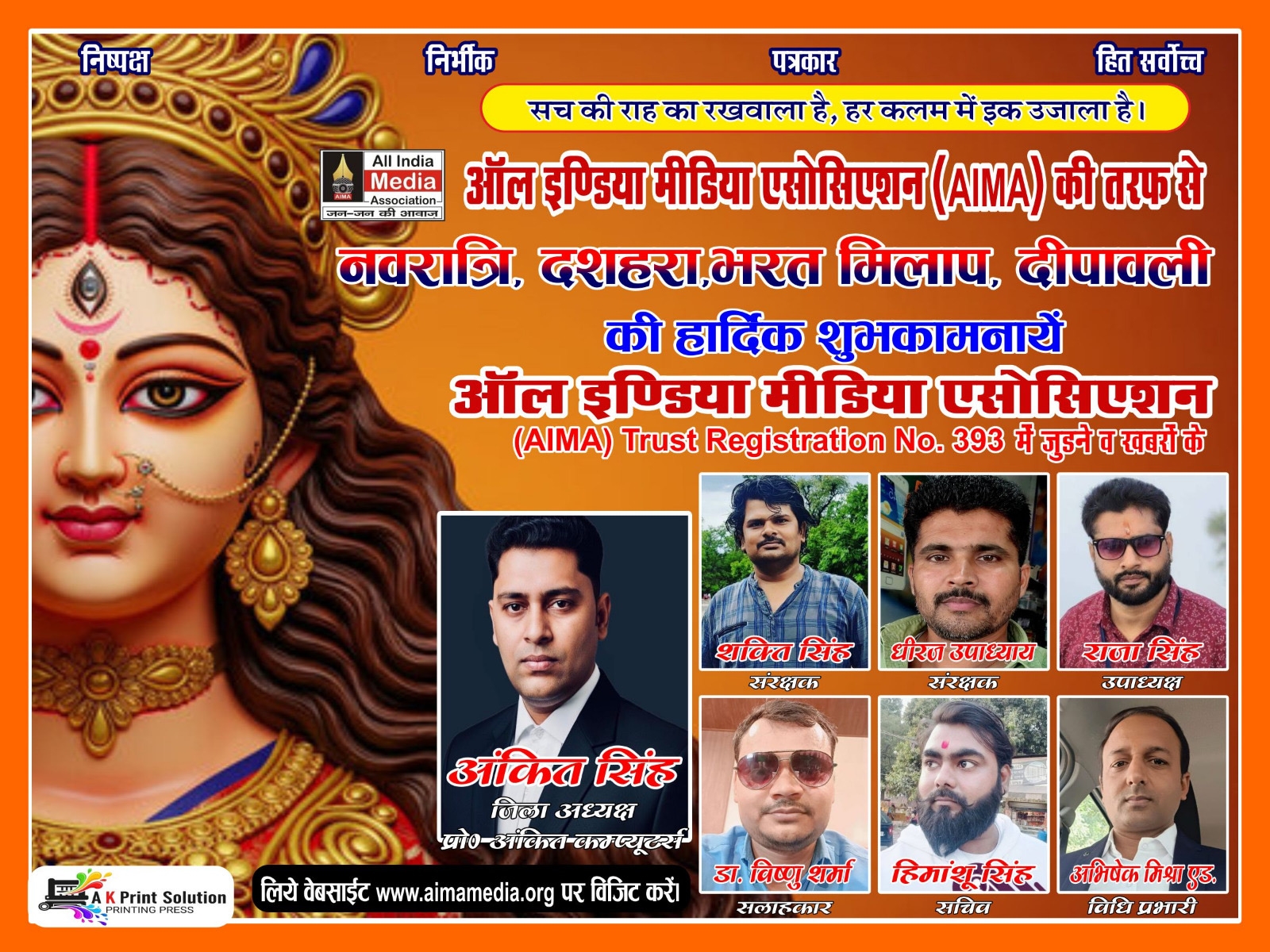 प्रतापगढ़। ऑल इंडिया मीडिया एसोसिएशन (AIMA) की ओर से नवरात्रि, दशहरा, भारत मिलाप और दीपावली के अवसर पर जिलेवासियों को हार्दिक शुभकामनाएं दी गई हैं। संस्था का मानना है कि त्योहार समाज में आपसी भाईचारा, एकता और सकारात्मक ऊर्जा का संचार करते हैं।