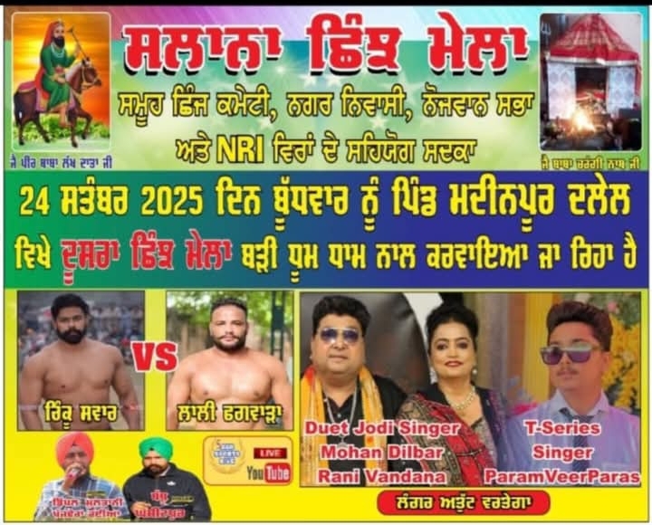 ਮੁਕੇਰੀਆਂ (ਪ੍ਰਿੰਸ ਠਾਕੁਰ) – ਸਮੂਹ ਜਿੱਥੇਬੰਦੀਆਂ, ਨਗਰ ਨਿਵਾਸੀਆਂ, ਨੌਜਵਾਨ ਸਭਾ ਅਤੇ NRI ਭਾਈਚਾਰੇ ਦੇ ਸਹਿਯੋਗ ਨਾਲ ਪਿੰਡ ਮਦੀਨਪੁਰ ਦਲੇਲ ਵਿਖੇ 24 ਸਤੰਬਰ 2025 ਨੂੰ ਵਿਸ਼ਾਲ ਦੂਸਰਾ ਛਿੰਝ ਮੇਲਾ ਕਰਵਾਇਆ ਜਾ ਰਿਹਾ ਹੈ।