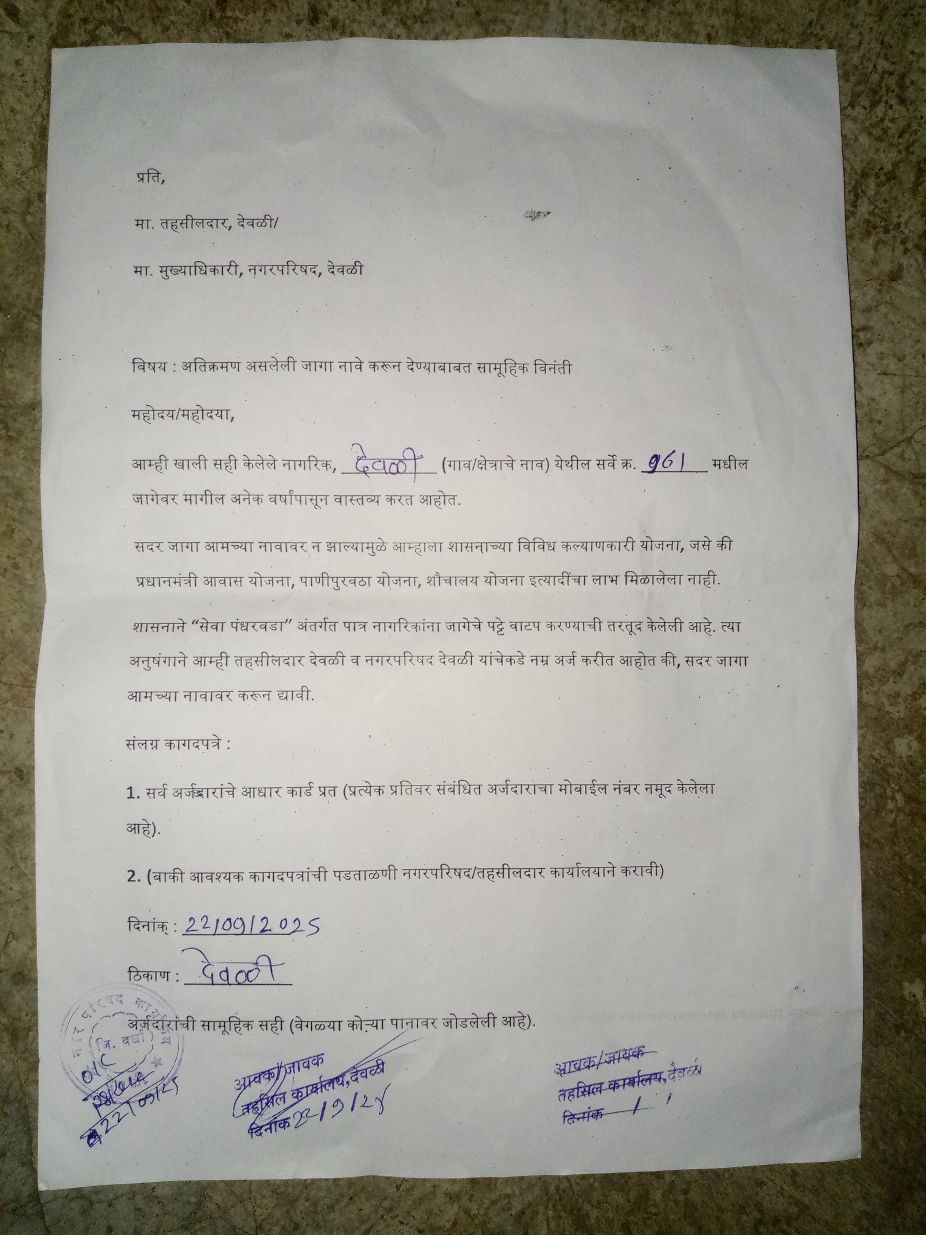 देवळी शहरातील प्रभाग क्रमांक 8, वार्ड नंबर 16, मीरंनाथ मंदिर मागील सर्वे नंबर 961 येथील नागरिकांच्या हक्कासाठी समाजसेवक तथा माजी नगराध्यक्ष जब्बार तवर यांच्या नेतृत्वाखाली आज नगरपरिषद मुख्याधिकारी व तहसीलदार देवळी यांना निवेदन सादर करण्यात आले.