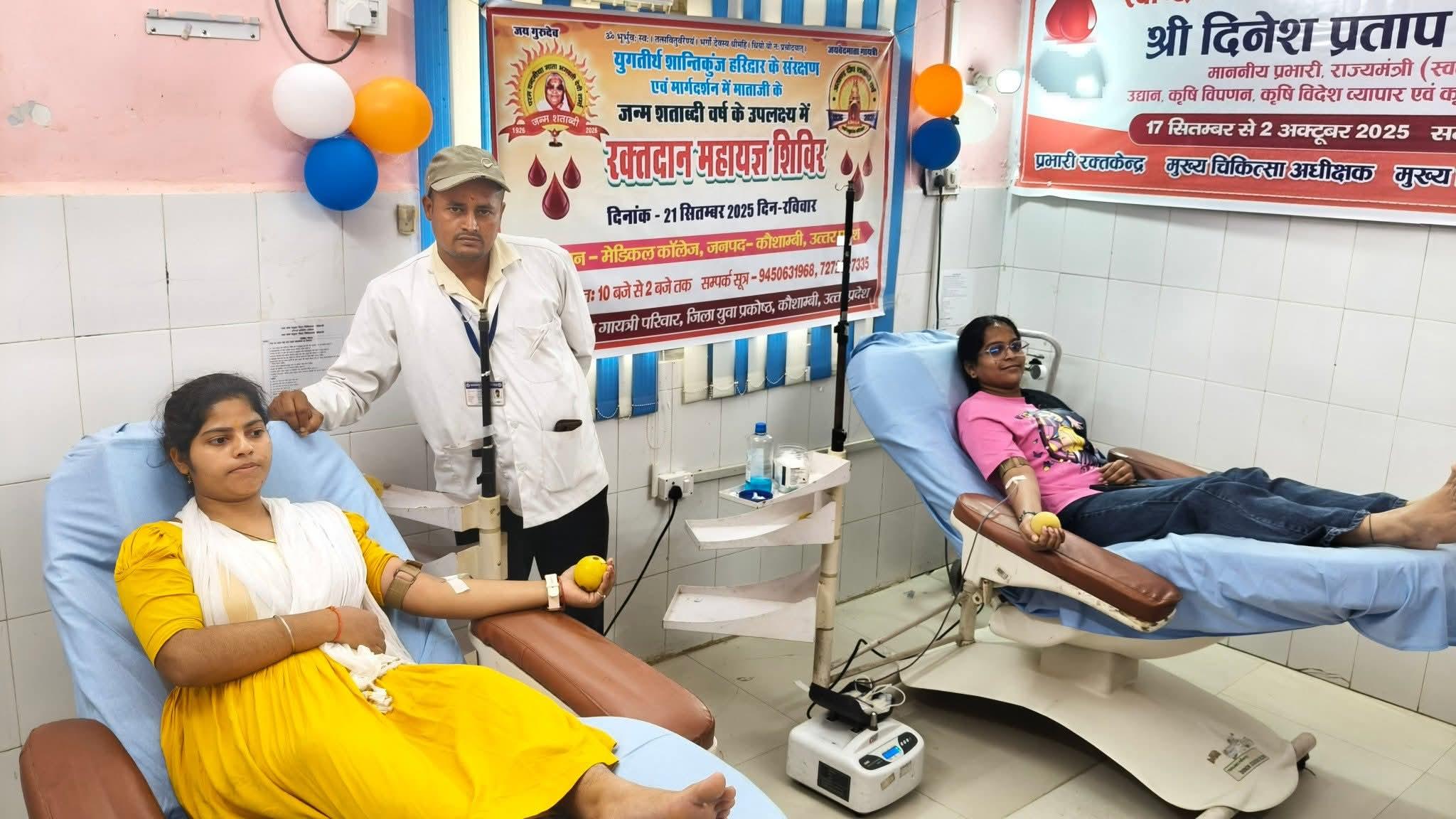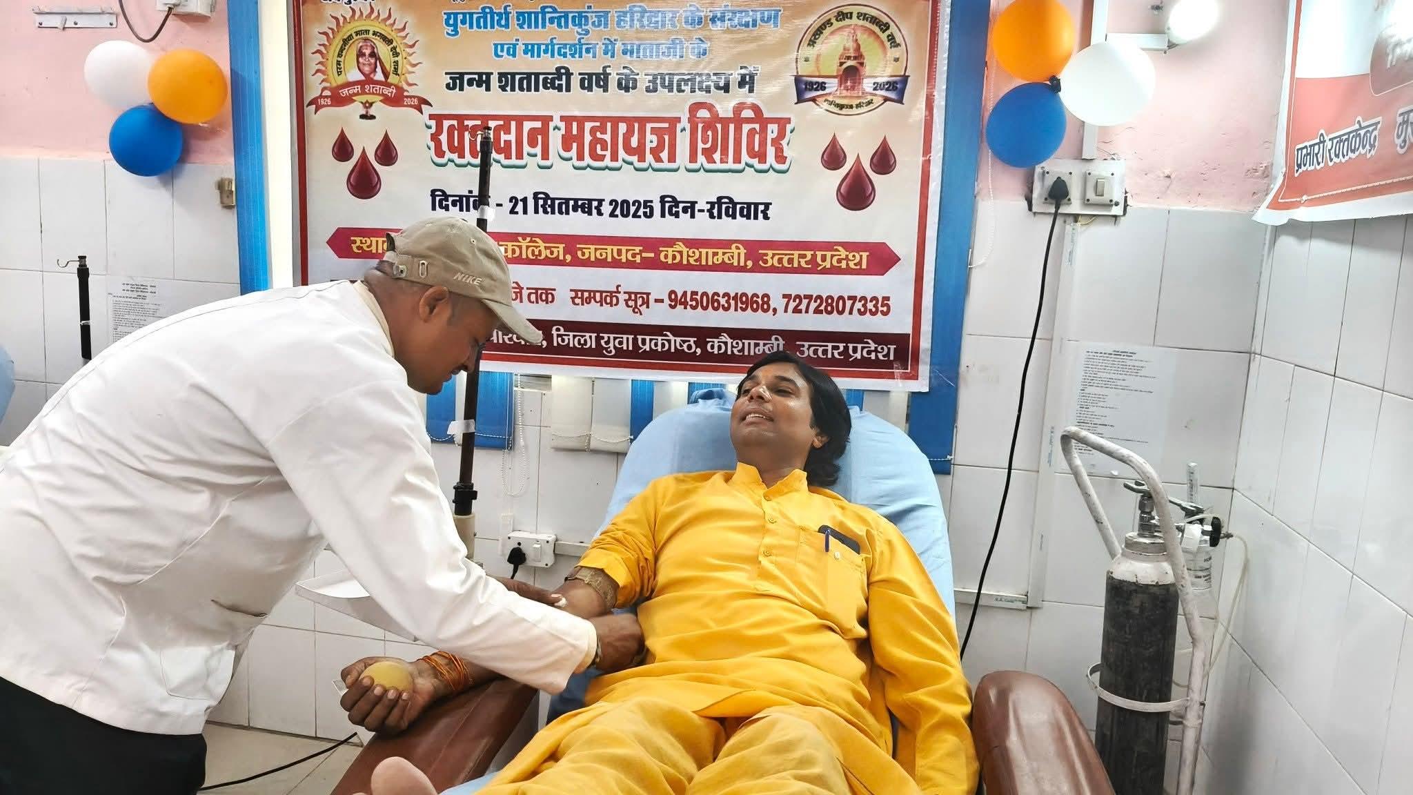 कौशांबी: अखिल विश्व गायत्री परिवार शांतिकुंज हरिद्वार के मार्गदर्शन में परम् वंदनीया माता भगवती देवी शर्मा जी की 99वीं जयंती के अवसर प्रांतीय युवा प्रकोष्ठ उत्तर प्रदेश के आह्वान पर प्रदेश के सभी जिलों में प्रांतीय रक्तदान महायज्ञ का आयोजन 21सितंबर रविवार को ब्लड बैंक जिला चिकित्सालय मंझनपुर कौशाम्बी में किया गया। रक्तदान महायज्ञ का उद्घाटन संयुक्त रूप में मेडिकल कॉलेज कौशांबी के प्राचार्य हरिओम कुमार सिंह सीएमएस कौशाम्बी डॉ. सुनील कुमार शुक्ला एवं परिजनों के द्वारा देवपूजन और दीप प्रज्ज्वलन के साथ आरंभ हुआ।