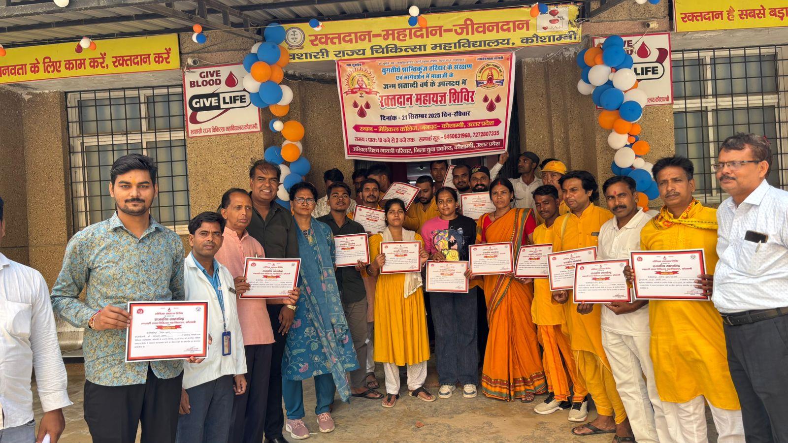 प्रांतीय रक्तदान महायज्ञ अभियान में गायत्री परिवार कौशाम्बी ने किया रक्तदान।