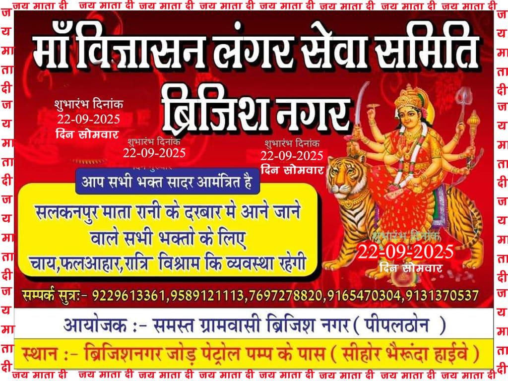 नवरात्रि में सलकनपुर पैदल चलकर दर्शन करने वाले भक्तों की सेवा के लिए यूं तो कई अलग अलग जगहों पर लंगर लगाया जाता है लेकीन बिरजिश नगर लंगर सेवा समिति भक्तों की सेवा 16 वर्षों से लगातार करती आ रही है और ये लंगर का 17वा साल है बिरजीश नगर से करीब 3 किलोमीटर दूर नसरुल्लागंज बायपास रोड पर ये लंगर लगाया जाता है जो कि सलकनपुर स्थित मंदिर दर्शन के लिए जो लोग दूर दूर से पैदल चलकर जाते हैं उनके लिए लंगर समिति निशुल्क भोजन पानी और ठहरने की भी व्यवस्था करती है जो 16 साल से लगातार करती आ रही है लंगर सेवा समिति अध्यक्ष राजेश मेवाड़ा ने बताया कि लंगर सेवा समिति द्वारा हर वर्ष की तरह इस वर्ष भी नवरात्रि में सलकनपुर मंदिर पैदल चलकर दर्शन करने वाले भक्तों के लिए हमने लंगर लगाया हुआ है जो पूरी तरह निशुल्क रहता है इसमें पीने का पानी भोजन और आराम करने के लिए बैठने की भी व्यवस्था रहती है इस लंगर में गांव वालों का पूर्ण सहयोग रहता है इस वर्ष भी इसकी शुरुआत कन्या भोजन के साथ की गई है जिसमें सैकडों की तादात में कन्याओं को भोजन कराया गया