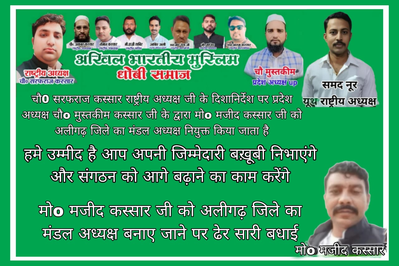 अखिल भारतीय मुस्लिम धोबी समाज के राष्ट्रीय अध्यक्ष चौo सरफराज कस्सार के निर्देश पर उत्तर प्रदेश के प्रदेश अध्यक्ष चौ0 मुस्तकीम कस्सार जी ने अलीगढ़ जिले से मो0 मजीद कस्सार जी को अलीगढ़ मंडल का मंडल अध्यक्ष बनाया है उम्मीद की आप बिरादर के लिए काम करेंगे धोबी समाज पर हो रहे अत्याचार पर जवाब देने ओर मदद करने का काम करेंगे अलीगढ़ जिले का मंडल अध्यक्ष बनाए। जाने पर राष्ट्रीय ओर प्रदेश ओर जिले की टीम ने बधाई दी राष्ट्रीय ओर प्रदेश की टीम हमेशा आप के साथ रहेगी आने वाले पंचायत चुनाव में मुस्लिम धोबी समाज से प्रधान ओर जिला पंचायत के चुनाव में खड़े होने वाले बिरादर भाई का राष्ट्रीय प्रदेश ओर जिले की टीम सपोर्ट करेगी भरोसा देने वाले राष्ट्रीय अध्यक्ष चौo सरफराज कस्सार,जाबिर कस्सार राष्ट्रीय मीडिया प्रभारी , राष्ट्रीय उपाध्यक्ष अकबर कस्सार राष्ट्रीय महासचिव शाहआलम कस्सार,राष्ट्रीय उपाध्यक्ष नौमान कस्सार,राष्ट्रीय महामंत्री शहजाद नेता जी राष्ट्रीय सचिव हाजी साबिर राष्ट्रीय प्रवक्ता माजिद कस्सार प्रदेश अध्यक्ष चौ0 मुस्तकीम कस्सार,प्रदेश उपाध्यक्ष इमरान शरीफ़, प्रदेश महामंत्री शमशाद अली, जिला अध्यक्ष सूफी इरशाद