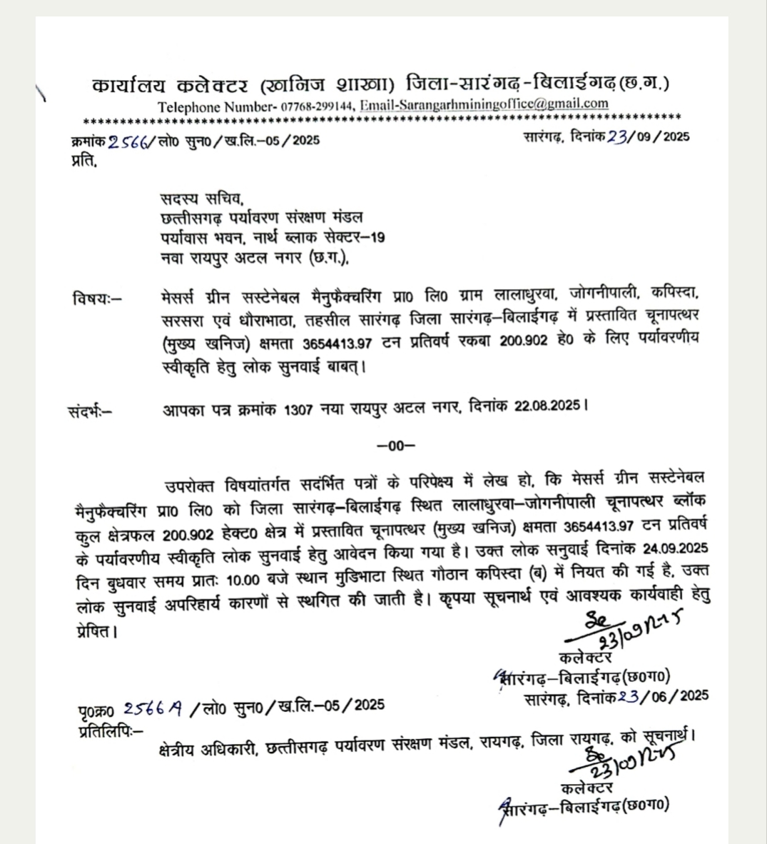 सारंगढ़। जिला कलेक्टर सारंगढ़-बिलाईगढ़ द्वारा जारी आदेश में बताया गया है कि मेसर्स ग्रीन सस्टेनेबल मेगाफूड्चारिय प्रा. लि. द्वारा प्रस्तावित खनिज पट्टा (मुख्य खनिज) के लिए पर्यावरणीय स्वीकृति हेतु निर्धारित लोक सुनवाई फिलहाल स्थगित कर दी गई है।
