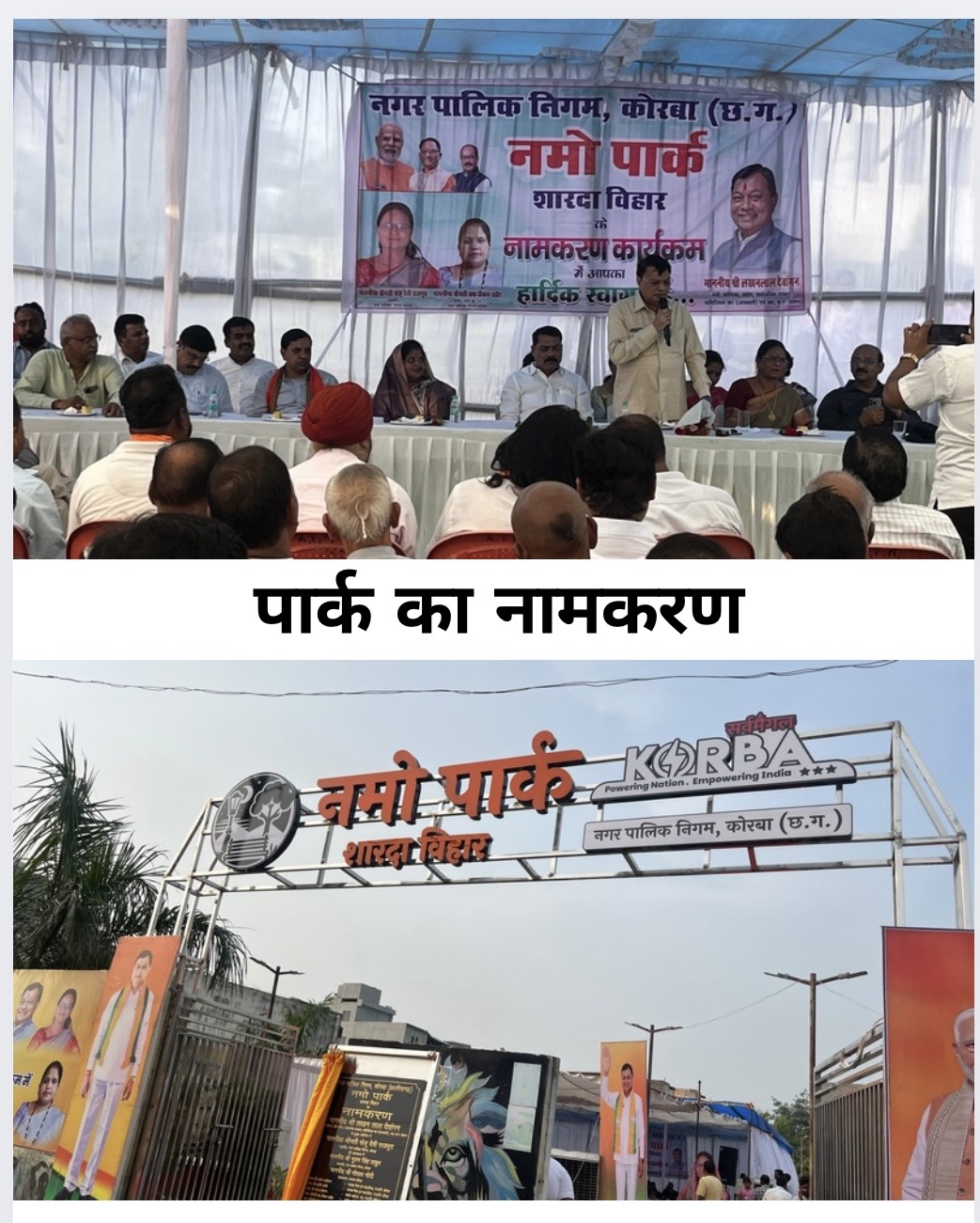 छत्तीसगढ़ कोरबा - शारदा विहार कोरबा में मोहल्ले वासियों के लिए पार्क का निर्माण कार्य शुरू हुआ था जो पूर्ण रूप से बनकर तैयार था आज छत्तीसगढ़ के उद्योग मंत्री लखन लाल देवांगन जी के माध्यम से पार्क का नामकरण किया गया जिसे नाम दिया गया नमो पार्क ।