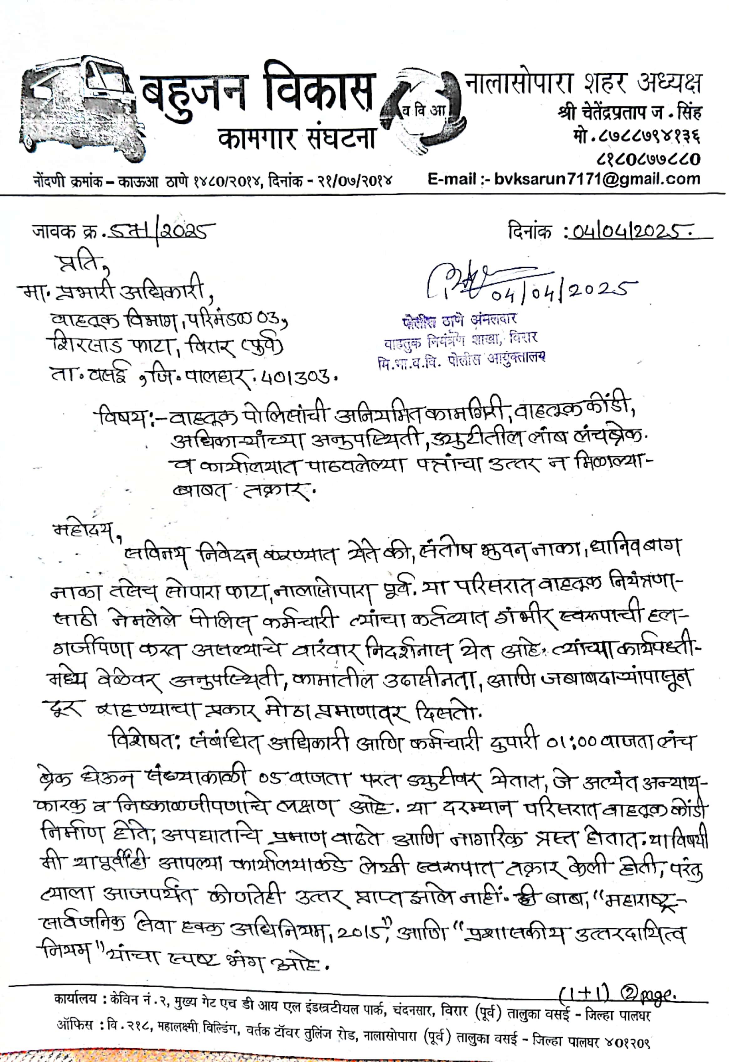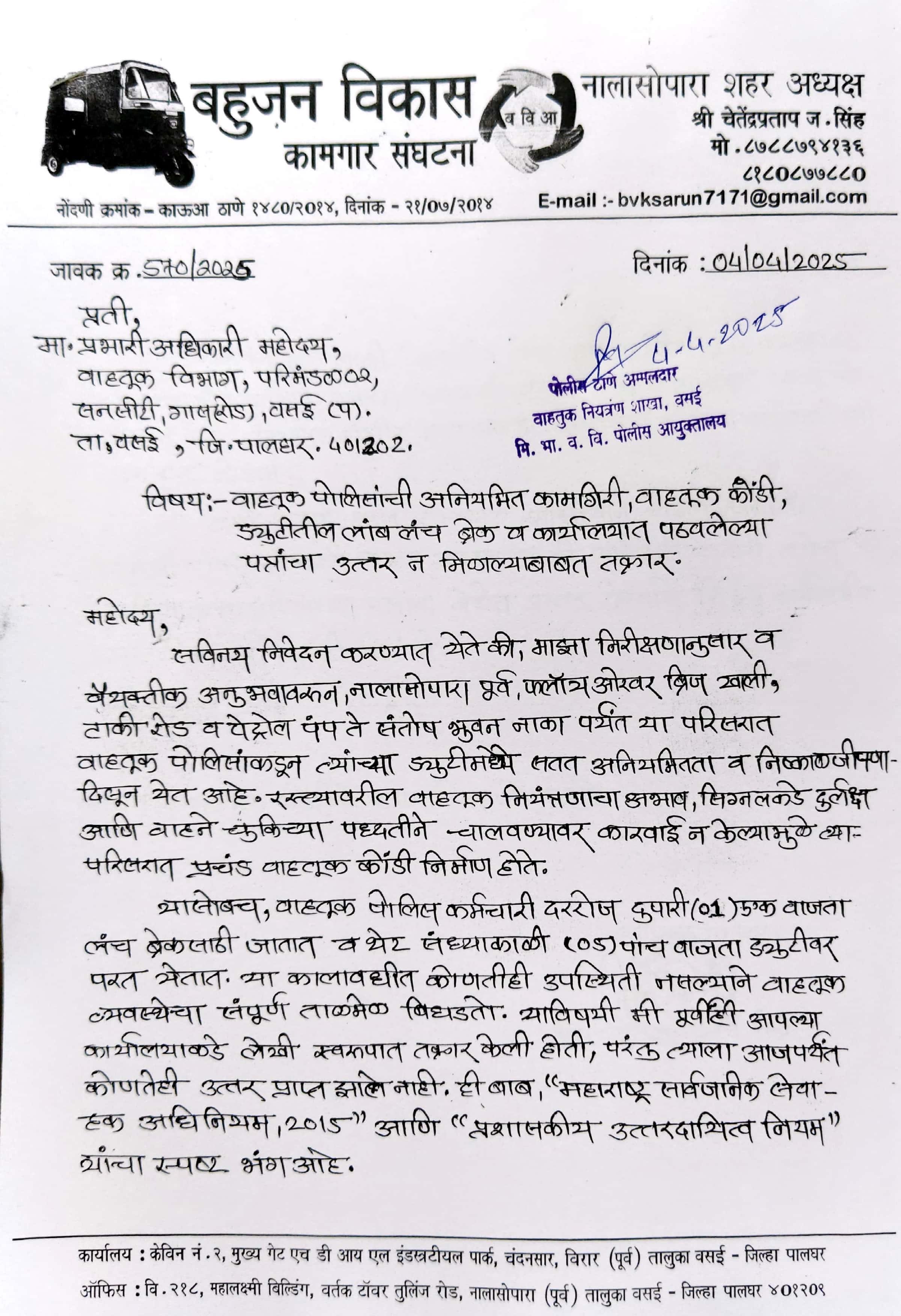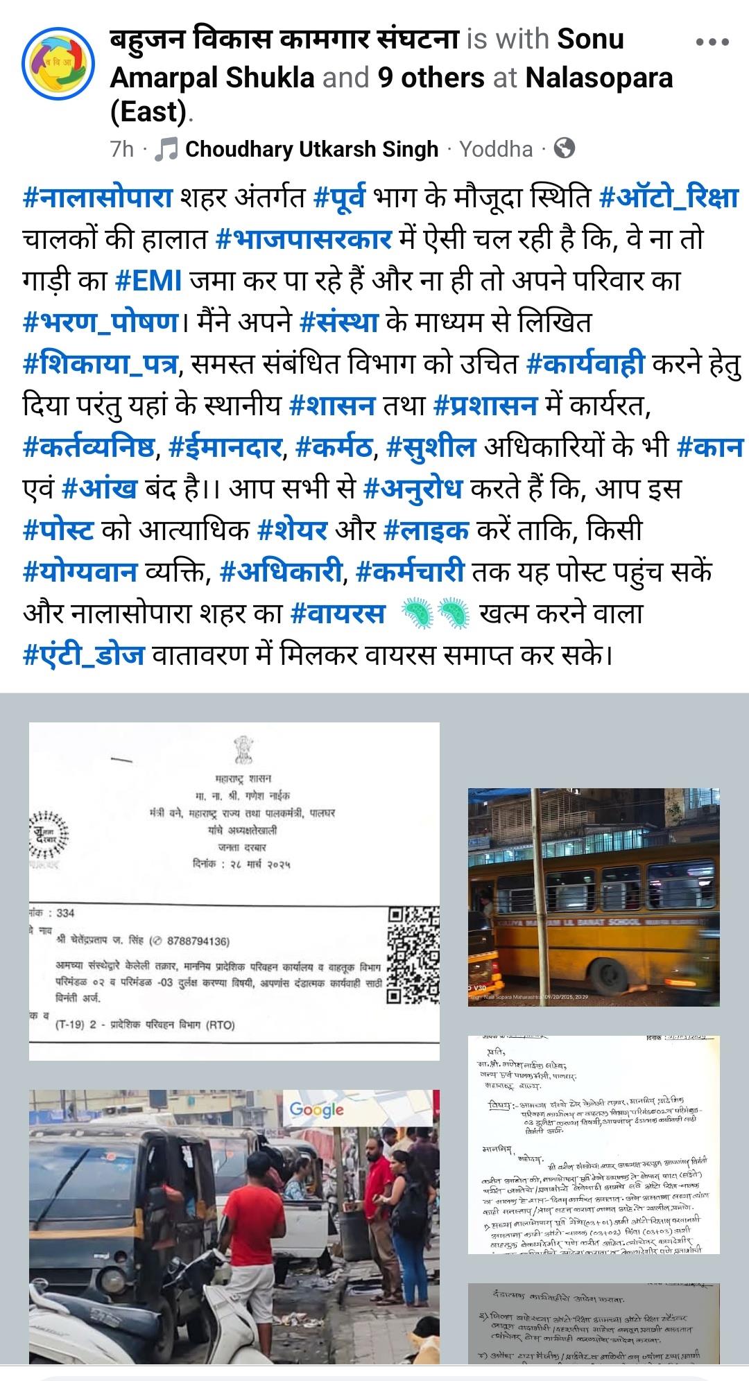 हमे प्राप्त सूचना अनुसार, महाराष्ट्र राज्य में पालघर जिले के मीरा भयंदर, वसई विरार पोलीस आयुक्तालय अंतर्गत नालासोपारा शहर की यह खबर है। जहां ऑटो रिक्षा चालकों की दैनंदिन आर्थिक और मानसिक स्थिति पर बड़ा प्रभाव पड़ रहा है। और स्थानीय शासन, प्रशाशन बैठा तमाशा देख रहा है। बीते कई दिनों से स्थानीय दबंगों की देखरेख और कुछ यातायात विभाग के कर्मचारियों के मिलीभगत से नालासोपारा पूर्व में अवैध टाटा मैजिक, प्राइवेट स्कूल बस, मारुति ओमनी, महिंद्रा बोलेरो जैसे बिना परवाना वाहनों द्वारा यात्रियों का परिवहन बडे पैमाने पर किया जा रहा है। यह जानते हुए कि, यदि दुर्भाग्यवश कोई अप्रिय घटना घाटित होने के बाद किसी भी मृतक या घायलों को सरकार तथा बीमा कंपनी द्वारा कोई सहायता नहीं प्रदान किया जाएगा।