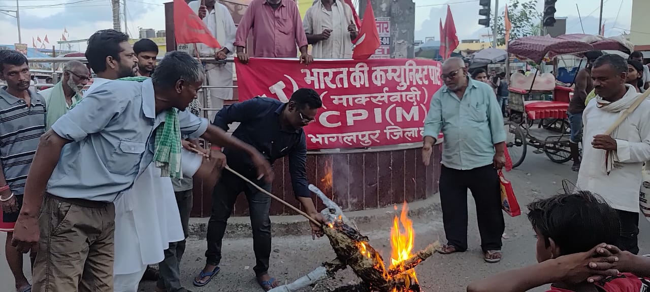 भागलपुर पीरपैंती में बिजली उत्पादन कारखाना खोलने हेतु बिहार सरकार ने गौतम अडानी को किसानों की उपजाऊ जमीन पर लाखों आम के पेड़ समेत कई बेश कीमती जमीन को बंजर जमीन घोषित कर 1050 एकड़ जमीन औने पौने तरीके से वन अधिनियमों की धज्जियां उड़ाते हुए बड़े कॉर्पोरेट अडानी के साथ समझौता ₹1 प्रति एकड़ प्रतिवर्ष के लिए कर लिया अव्यावहारिक समझौते के विरोध में एवं समझौता को रद्द करने की मांग को लेकर भारत की कम्युनिस्ट पार्टी मार्क्सवादी ने राजव्यापी प्रतिरोध तथा नरेंद्र मोदी और नीतीश सरकार का पुतला दहन कार्यक्रम के संदर्भ में भागलपुर रेलवे स्टेशन चौक डॉक्टर भीमराव अंबेडकर पार्क के निकट पुतला दहन एवं प्रतिरोध सभा का आयोजन मार्क्सवादी कम्युनिस्ट पार्टी भागलपुर जिला कमेटी की ओर से किया गया प्रतिरोध सभा को संबोधित करते हुए पार्टी नेताओं ने कहा आज नीतीश एवं नरेंद्र मोदी सरकार ने गौतम अडानी को लाभ पहुंचाने के लिए किसानों की उपजाऊ जमीन दी जा रही है आज नीतीश कुमार सभी बेघर भूमिहीनों के लिए घर बनाने का फायदा भूल चुके हैं दूसरे बिहार में भूमि सुधार कानून अभी तक ठंडे वस्ते में डाल दिया परचाधारियों के नवगछिया दादपुर में बेदखल दबंगों द्वारा किया जा रहा है लेकिन उसे बसाने के लिए सरकार कुंभ करनी निद्रा में सो रही है इसलिए कॉर्पोरेट नरेंद्र मोदी नीतीश कुमार की सरकार को इस बिहार में उखाड़ फेंकने का काम करेंगे संबोधित करने वाले में पार्टी जिला सचिव दशरथ प्रसाद कॉमरेड मनोज कुमार गुप्ता मनोहर मंडल विनोद मंडल डॉमी मंडल अरुण मंडल मोहम्मद फैज अहमद भगवान मंडल मोहम्मद राशिद अली उर्फ छेदी बबलू ठाकुर रामविलास यादव DYFI के पिंटू राज कपिल महतो गीगल महतो प्रकाश मृधा