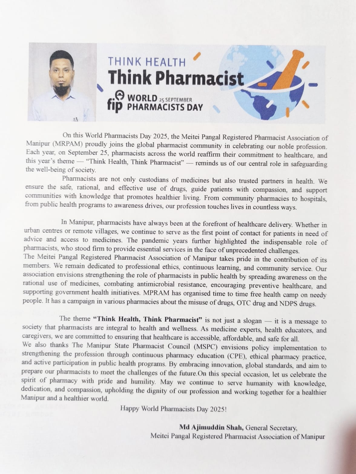 The Manipur State Pharmacy Council (MSPC) is gearing up to celebrate the 25th anniversary of World Pharmacy Day in Imphal. According to MSPC President, the theme of this year's celebration is "Think Health, Think Pharmacies." To ensure a smooth celebration, the council has requested that no bandh or strike be called on the scheduled date .