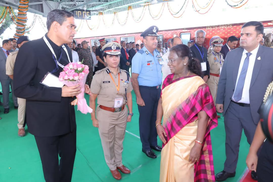 महामहिम राष्ट्रपति श्रीमती द्रौपदी मुर्मु जी लगभग प्रातः 10 बजे वृन्दावन रोड रेलवे स्टेशन पहुँची। वृन्दावन रोड रेलवे स्टेशन पर महामहिम राष्ट्रपति श्रीमती द्रौपदी मुर्मु जी का स्वागत मा० मंत्री गन्ना विकास एवं चीनी उद्योग श्री लक्ष्मी नारायण चौधरी जी, माननीय महापौर श्री विनोद कुमार अग्रवाल जी, अपर पुलिस महानिदेशक अनुपम कुलश्रेष्ठ जी, मण्डलायुक्त शैलेन्द्र कुमार सिंह जी, जिलाधिकारी चन्द्र प्रकाश सिंह जी वरिष्ठ पुलिस अधीक्षक श्लोक कुमार जी आदि द्वारा किया गया।