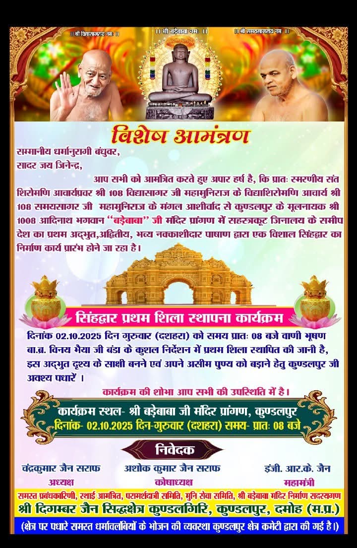 *सिंहद्वार प्रथम शिला स्थापना कार्यक्रम-* दिनांक 02.10.2025 दिन गुरुवार (दशहरा) को समय प्रातः 8:00 बजे वाणी भूषण बाल ब्रह्मचारी विनय भैया जी बण्डा के कुशल निर्देशन में प्रथम शिला स्थापित की जानी है। इस अद्भुत दृश्य के साक्षी बने एवं अपने असीम पुण्य को बढ़ाने हेतु कुंडलपुर जी अवश्य पधारे ।