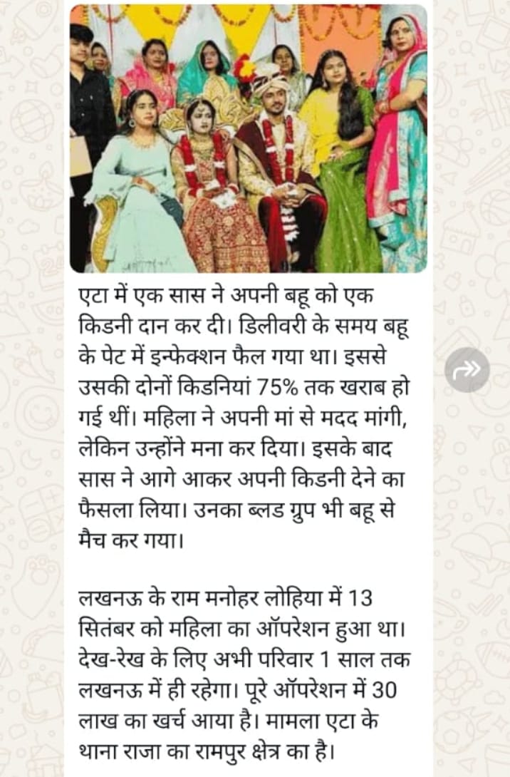 यह मामला थाना राजा के रामपुर क्षेत्र का है बेटी की मां अपने बेटी के मरने का इंतजार कर रही थी कि यह कब मरेगी तो उसकी ससुराल वालों को लूटा जाएगा लेकिन स एक बड़ी मिसाल बनकर सामने आई जिसने अपनी बहू को किडनी देकर उसकी जान को बचाया सास से बहू का ब्लड ग्रुप मैच कर गया और सास ने उसकी किडनी देने का फैसला किया
