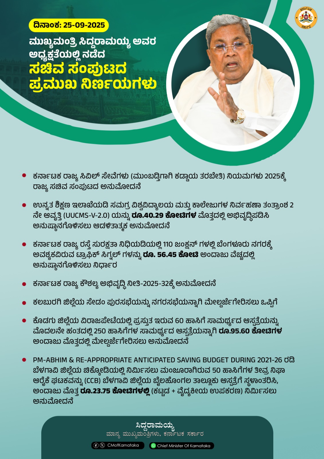 ಮುಖ್ಯಮಂತ್ರಿ ಸಿದ್ದರಾಮಯ್ಯ ಅವರ ಅಧ್ಯಕ್ಷತೆಯಲ್ಲಿ ನಡೆದ ಸಚಿವ ಸಂಪುಟ ಸಭೆಯಲ್ಲಿ ಕೈಗೊಂಡ ಪ್ರಮುಖ ನಿರ್ಣಯಗಳು ಹೀಗಿವೆ