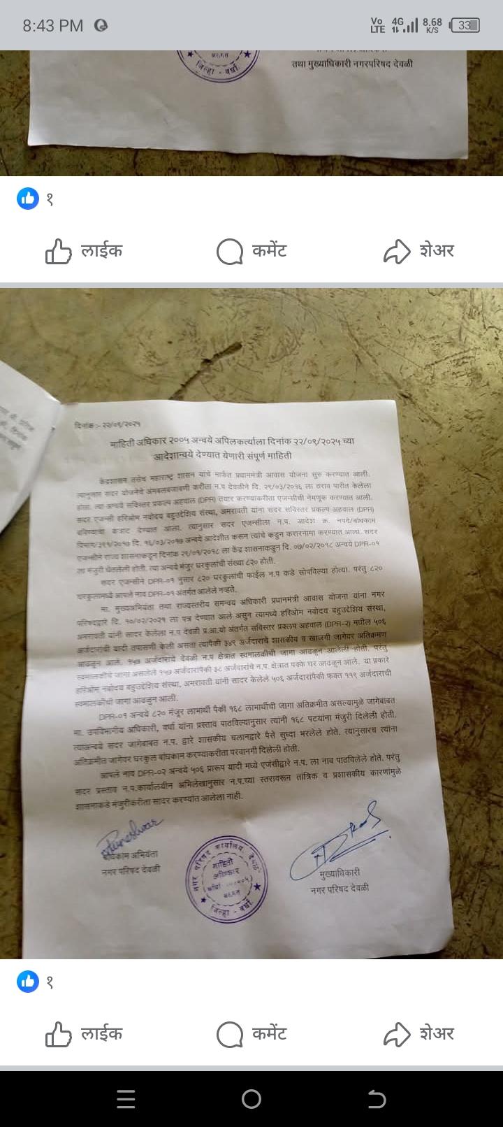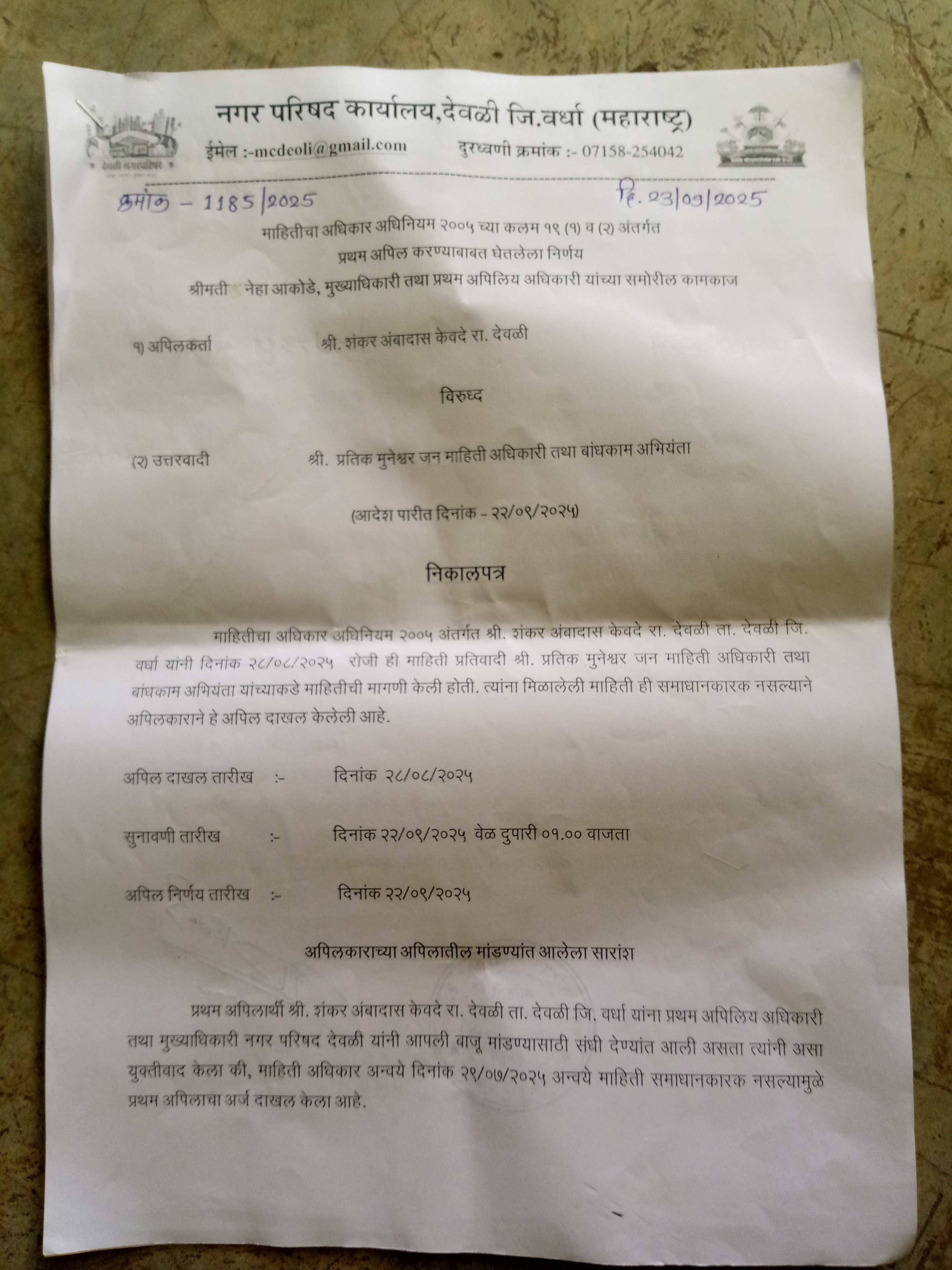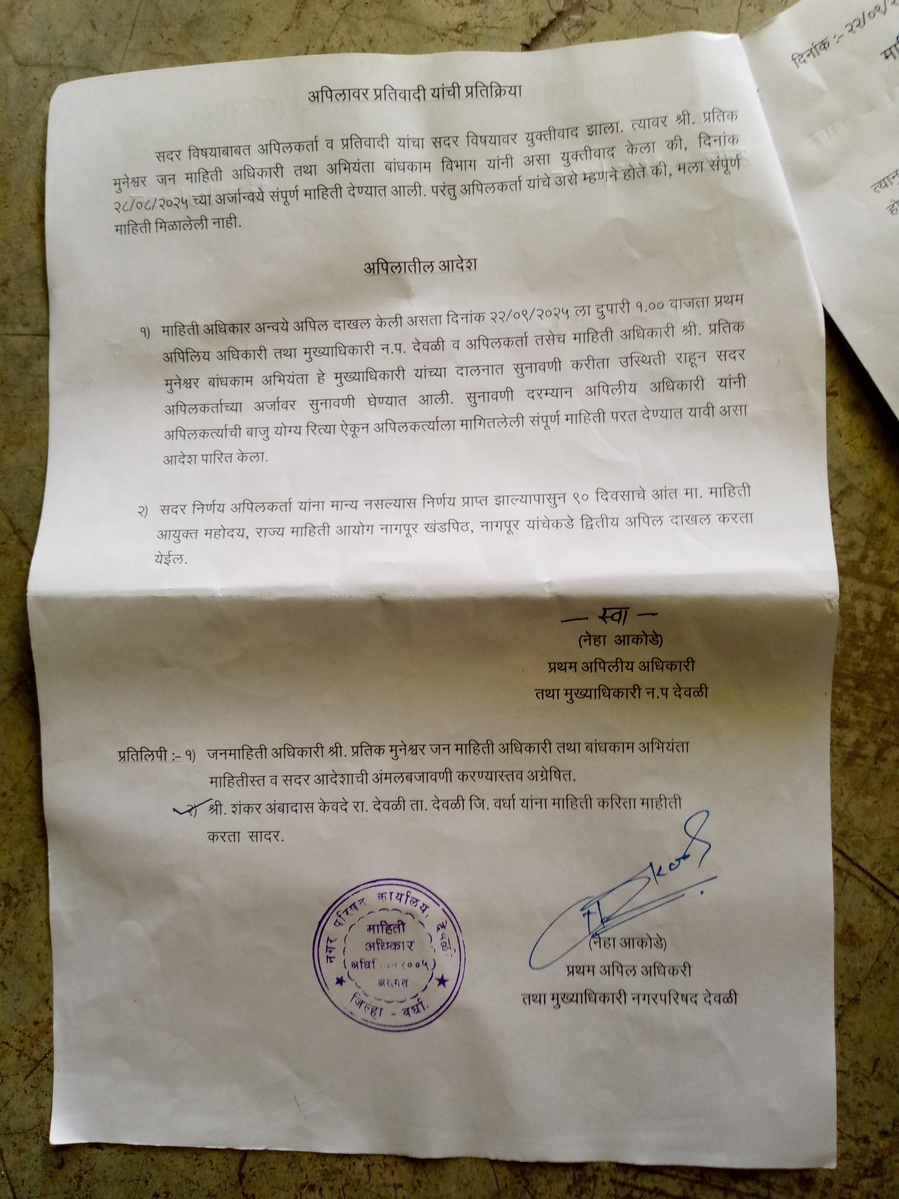 1. मी दिनांक २९/०७/२०२५ रोजी माहिती अधिकार कायदा २००५अंतर्गत नगर परिषद देवळी, जि. वर्धा येथे अर्ज दाखल केला होता.