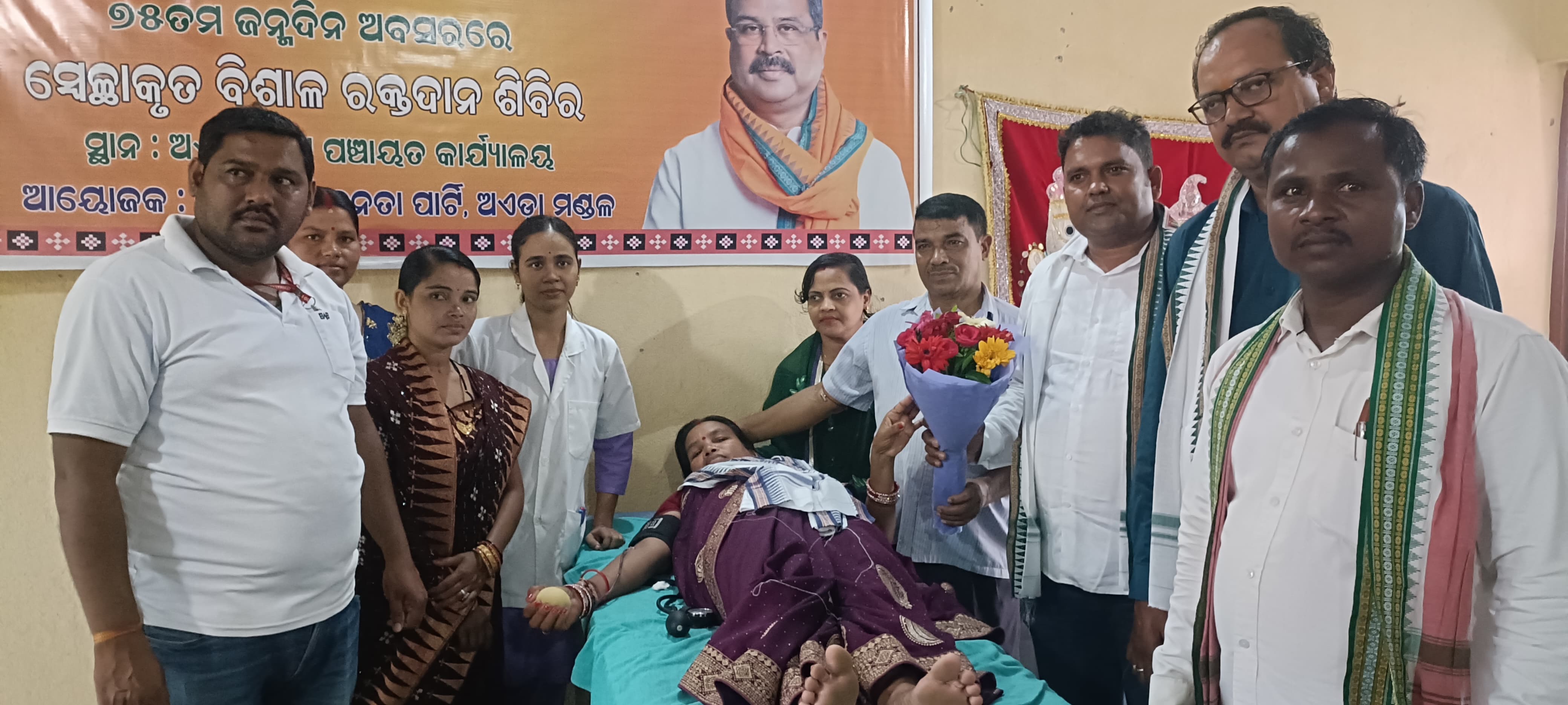 ଆଠମଲ୍ଲିକ :ପ୍ରଧାନମନ୍ତ୍ରୀ ନରେନ୍ଦ୍ର ମୋଦି ଙ୍କ ଜନ୍ମ ଦିନ ଠାରୁ ପନ୍ଦର ଦିନ ବ୍ୟାପୀ ଚାଲୁ ଥିବା ସେବା ପକ୍ଷ ପରୀପ୍ରେକ୍ଷୀରେ କେନ୍ଦ୍ର ଶିକ୍ଷାମନ୍ତ୍ରୀ ତଥା ସମ୍ବଲପୁର ସାଂସଦ ଧର୍ମେନ୍ଦ୍ର ପ୍ରଧାନଙ୍କ ଆହ୍ୱାନ କ୍ରମେ ରେ ଆଜି ଆଠମଲ୍ଲିକ ବ୍ଲକ ଅନ୍ତର୍ଗତ ଅଇଡା ଗ୍ରାମ ପଞ୍ଚାୟତ କାର୍ଯ୍ୟାଳୟ ଠାରେ ଭାରତୀୟ ଜନତା ପାର୍ଟି ଅଇଡ଼ା ମଣ୍ଡଳ ପକ୍ଷରୁ ଏକ ସ୍ଵେଚ୍ଛାକୃତ ରକ୍ତଦାନ ଶିବିର ଅନୁଷ୍ଠିତ ହୋଇଯାଇଛି । ଏହି ଶିବିରରେ ୮୪ ୟୁନିଟ୍ ରକ୍ତ ସଂଗ୍ରହ ହୋଇଥିଲା। ଅନୁଗୋଳ ଜିଲ୍ଲା ବିଜେପି ଉପ ସଭାପତି ଅଜୁର୍ନ କୁମାର ସାହୁ ,ଜିଲ୍ଲା ସାଧାରଣ ସମ୍ପାଦକ ଭବାନୀ ଶଙ୍କର ଯୋତିଶରାୟ ,ରାଜ୍ୟ କାର୍ଯ୍ୟ ପରିଷଦ ସଭ୍ୟ ପରେଶ ଦେଓ ,ଅଇଡା ସରପଞ୍ଚ ସୁବାଶିନୀ ସେଠୀ , ନଗର ମଣ୍ଡଳ ଜିଲ୍ଲା ପ୍ରତିନିଧି ଅବନୀ ପ୍ରଧାନ, କାଉନସିଲର ତଥା ଯୁବ ନେତା ନୁତନ ବେହେରା, ନଗର ମଣ୍ଡଳ ସଭାନେତ୍ରୀ ଶୈଳବାଳା ଅମାନ୍ତ ,ଅନ୍ୟତମ ଅତିଥି ଭାବରେ ଆଠମଲ୍ଲିକ ତହସିଲଦାର ପ୍ରସନ୍ନ ଟେଟେ ଆଠମଲ୍ଲିକ ଗୋଷ୍ଠୀ ଉନ୍ନୟନ ଅଧିକାରୀ ଟିଟସ ମହାନନ୍ଦିଆ ଯୋଗଦେଇ ରକ୍ତଦାତା ଙ୍କୁ ଉତ୍ସାହିତ କରିଥିଲେ । ଆଠମଲ୍ଲିକ ବ୍ଲଡ ବ୍ୟାଙ୍କ୍ ତରଫରୁ ରକ୍ତ ସଂଗ୍ରହ କରାଯାଇଥିଲା।ସମସ୍ତ କାର୍ଯ୍ୟ ମଣ୍ଡଳର ସଭାପତି ରଞ୍ଜିତ କୁମାର ମୁଣ୍ଡା ଙ୍କ ପ୍ରତ୍ୟେକ୍ଷ ତତ୍ଵାବଧାନ ରେ ଆୟୋଜିତ ହୋଇଥିବା ବେଳେ ଦଳର ସମସ୍ତ ଶୀର୍ଷ କାର୍ଯ୍ୟକର୍ତ୍ତା ସହଯୋଗ କରିଥିଲେ ।
