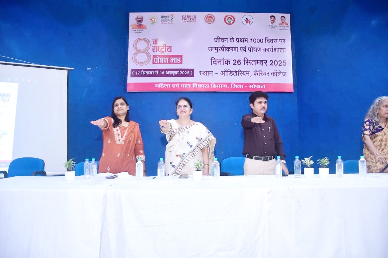 पोषण माह के अंतर्गत आज जिला स्तरीय जीवन के प्रथम 1000 दिवस पर पुरुषों में जागरूकता एवं सहभागिता विषय पर उन्मुखीकरण कार्यक्रम का आयोजन कैरियर कॉलेज के ऑडिटोरियम में किया गया। जिसमें संयुक्त संचालक महिला एवं बाल विकास भोपाल,उप संचालक, पोषण विशेषज्ञ, स्त्री रोग विशेषज्ञ, जिला कार्यक्रम अधिकारी,कॉलेज की प्राचार्य चरणजीत कौर सहित समस्त सहायक संचालक समस्त परियोजना अधिकारी, जिले के विभिन्न स्थानों से आए पुरुष प्रतिभागी, कॉलेज के बच्चे, पर्यवेक्षक अशासकीय संस्थाओं के सदस्य एवं आंगनबाड़ी कार्यकर्ताएं सहित 350 प्रतिभागी उपस्थित थे। कार्यक्रम में विगत 8 दिनों में जिले में पोषण माह अंतर्गत किए गए कार्यों के बारे में बताया तथा जीवन के प्रथम 1000 दिवस पर पुरुषों में जागरूकता तथा विशेष कर पुरुषों के द्वारा बनाई गई रेसिपी का पोषण व्यंजन प्रदर्शन के बारे में चर्चा की गई। विषय विशेषज्ञ ने सुनहरे 1000 दिवस पर विस्तृत चर्चा की और उसमें बच्चों, गर्भवती महिलाओं को गर्भावस्था के दौरान क्या खाना है और क्या नहीं खाना है,किस तरह का मिनरल्स, विटामिन प्रोटीन और क्या डाइट होनी चाहिए उस पर विशेष चर्चा की प्रसव की तैयारी के साथ-साथ बाद होने वाले बच्चों की तैयारी के साथ-साथ प्रसव पश्चात्‌ किस तरीके से उनके 2 साल तक खान-पान पर विशेष ध्यान देना है, चर्चा कर प्रतिभागियों को अवगत कराया तथा पुरुष सहभागिता यदि बढ़ती है तो निश्चित रूप से स्वस्थ परिवार का सपना साकार होगा,पोषण आहार की विशेषज्ञ के द्वारा पौष्टिक खाना घर में कैसे पकाए एवं घर में पकाएं खाने पर विशेष जोर दिया जंक फूड खाने से होने वाले नुकसान जैसे मोटापा, थकान पर चर्चा की।, लोकल फॉर वोकल अंतर्गत किचन गार्डन या आसपास उपलब्ध अनाज सब्जियां है उनको किस तरीके से पौष्टिक बनाकर खाया जाए उसके संबंध में चर्चा की और साथ में बच्चों द्वारा बच्चों द्वारा एवं पुरुष प्रतिभागियों द्वारा जो रेसिपी बनाई गई थी उनकी सराहना करते हुए उनको और मोटिवेट किया कि किस-किस तरह की रेसिपी बनाई जा सकती है।आरंभ संस्था की टीम लीडर के द्वारा पौष्टिक आहार वर्सेस जंक फूड पर एक रोचक नाटक का प्रदर्शन किया गया जिसमें प्रतिभागियों ने जंक फूड के नुकसान एवं दाल, अनाज, अन्न हरी पत्तेदार सब्जियां से बने खाने के फायदे को रोचक नाटक द्वारा प्रदर्शित किया गया। करियर कॉलेज की प्राचार्य डॉ.चरणजीत कौर के द्वारा कॉलेज में विद्यार्थियों को पोषण पौष्टिक भोजन को व्यवहार में लाने के लिए चर्चा की एवं साथ ही कॉलेज में चल रही गतिविधियों के बारे में प्रतिभागियों को अवगत कराया। साथ ही इस प्रकार की पहल सुनहरे 1000 दिवस एवं पौष्टिक भोजन पर पुरुषों में जागरूकता अभियान चलाने की सराहना की।संयुक्त संचालक द्वारा अप