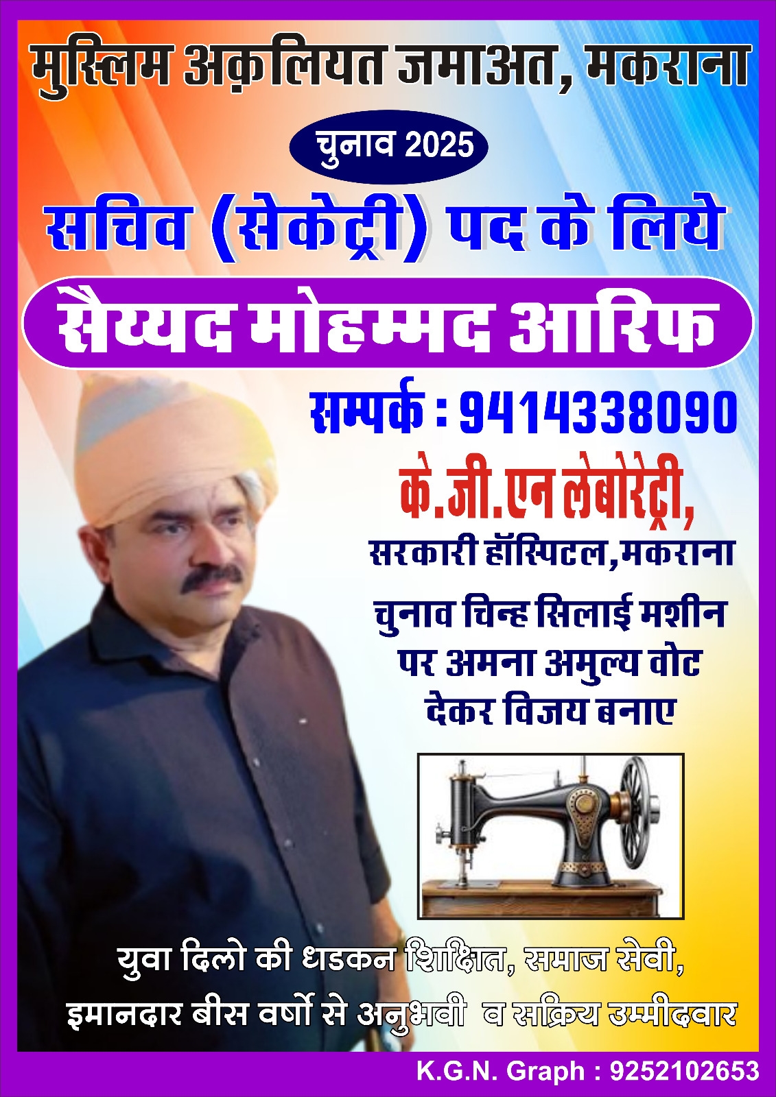 मकराना मुस्लिम अकलियत जमाअत सेक्रेटरी पद पर मोहम्मद आरिफ चुनाव चिन्ह सिलाई मशीन