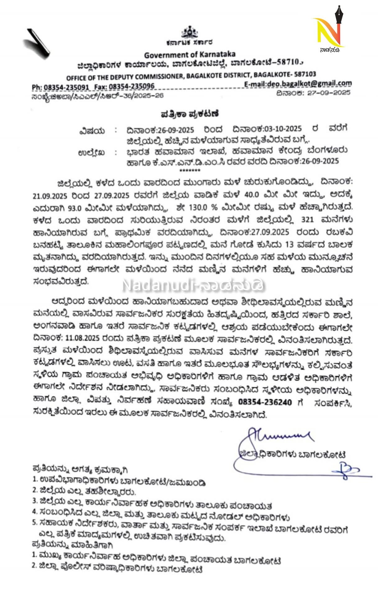ಬಾಗಲಕೋಟೆ: ಅಕ್ಟೋಬರ್ ೩ರವರೆಗೆ ಜಿಲ್ಲೆಯಲ್ಲಿ ಮಳೆಯಾಗುವ ಸಾಧ್ಯತೆ ಇದ್ದು, ಜನತೆ ಎಚ್ಚರಿಕೆಯಿಂದ ಇರಬೇಕೆಂದು ಹವಾಮಾನ ಇಲಾಖೆ ಮುನ್ಸೂಚನೆ ನೀಡಿದೆ."