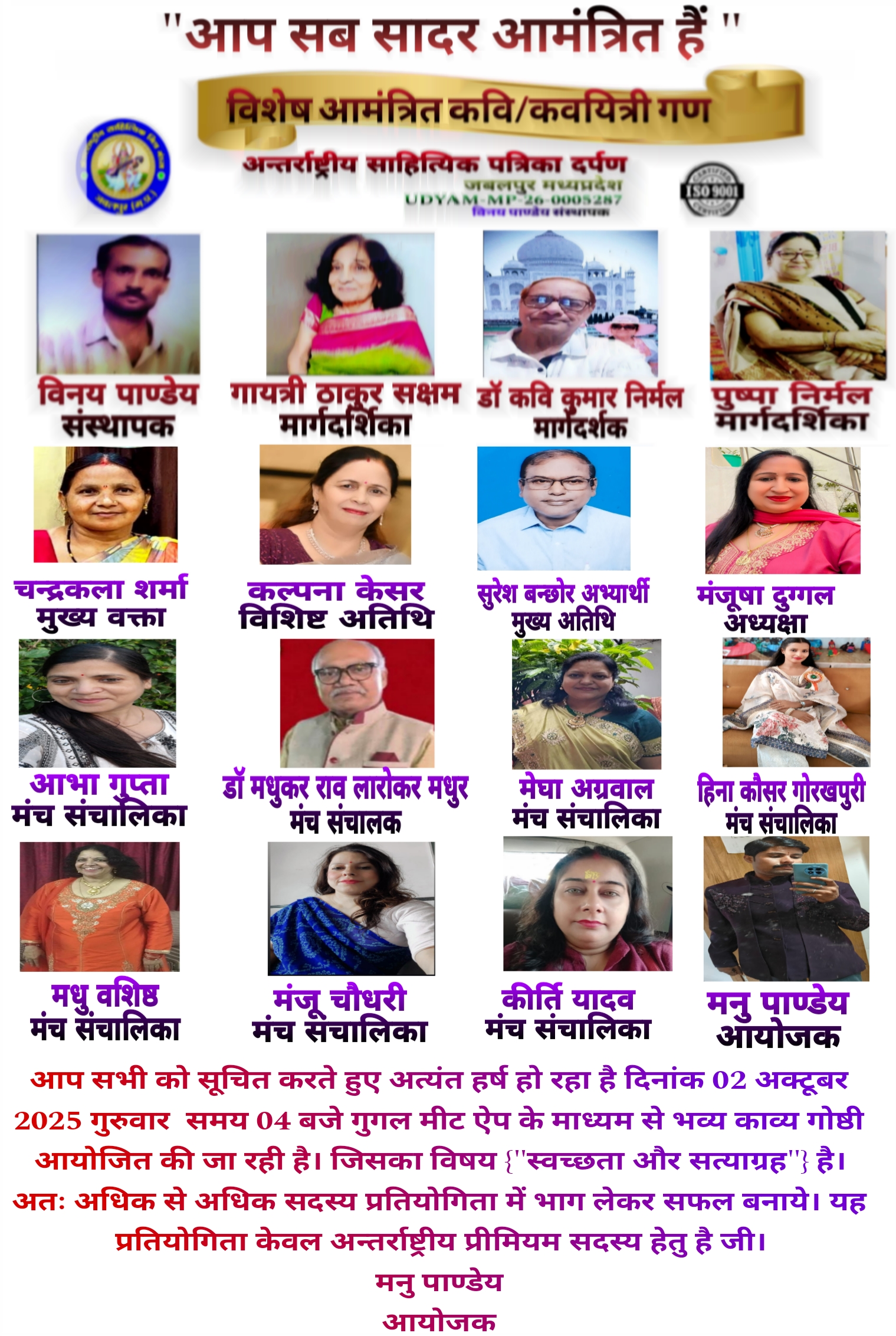 दिनांक 02 अक्टूबर 2025 गुरुवार को गुगल मीट के माध्यम से भव्य काव्य गोष्ठी आयोजित हो रही है।